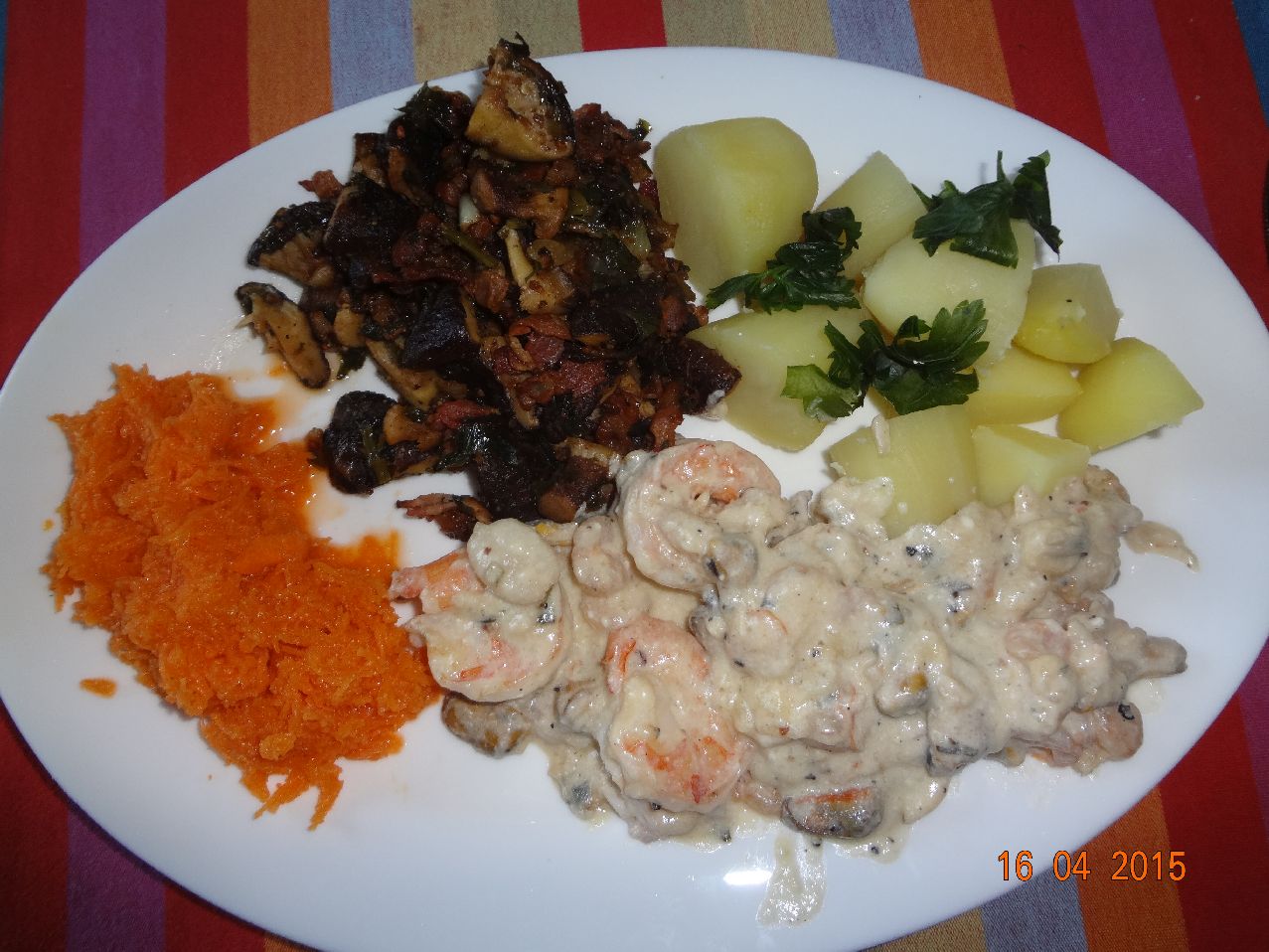 | Kartoffel-Walnuss-Stampf und Riesen-Garnelen (*), Möhren-Salat |
