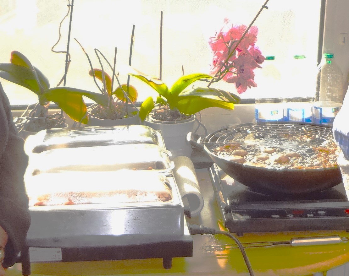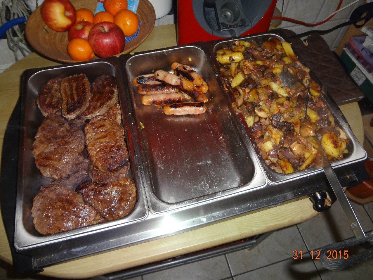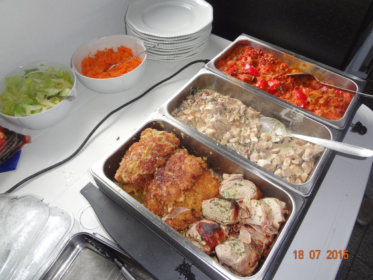 | Hähnchen-Schnitzel, Schweine-Filet im Speck-Mantel, Pilze in Sekt-Rahm-Soße, Ratatui und RosmKart, MöSa, EisbSal. |
