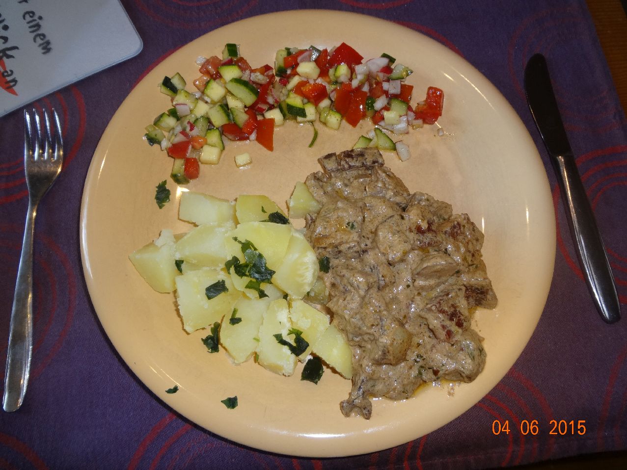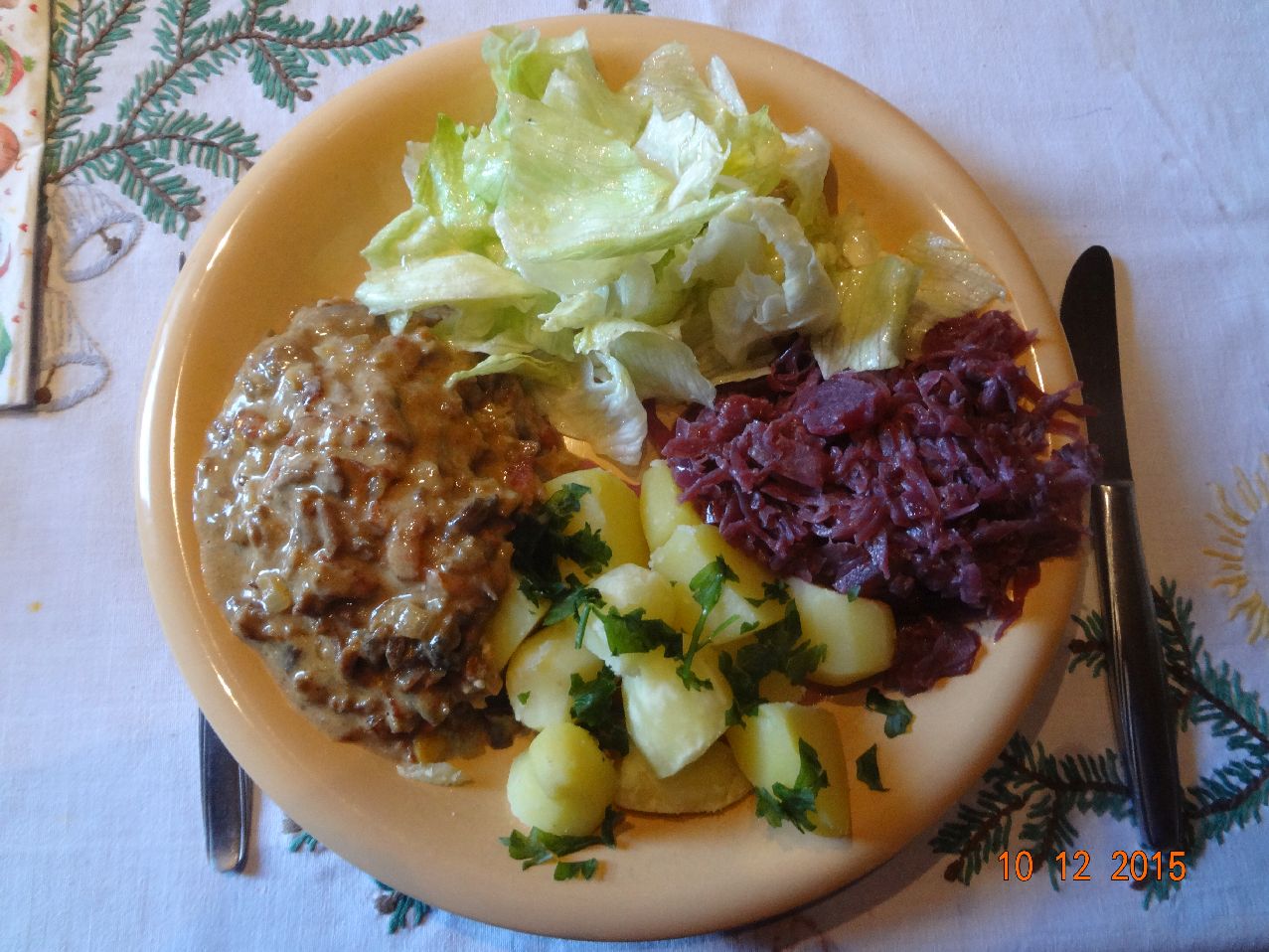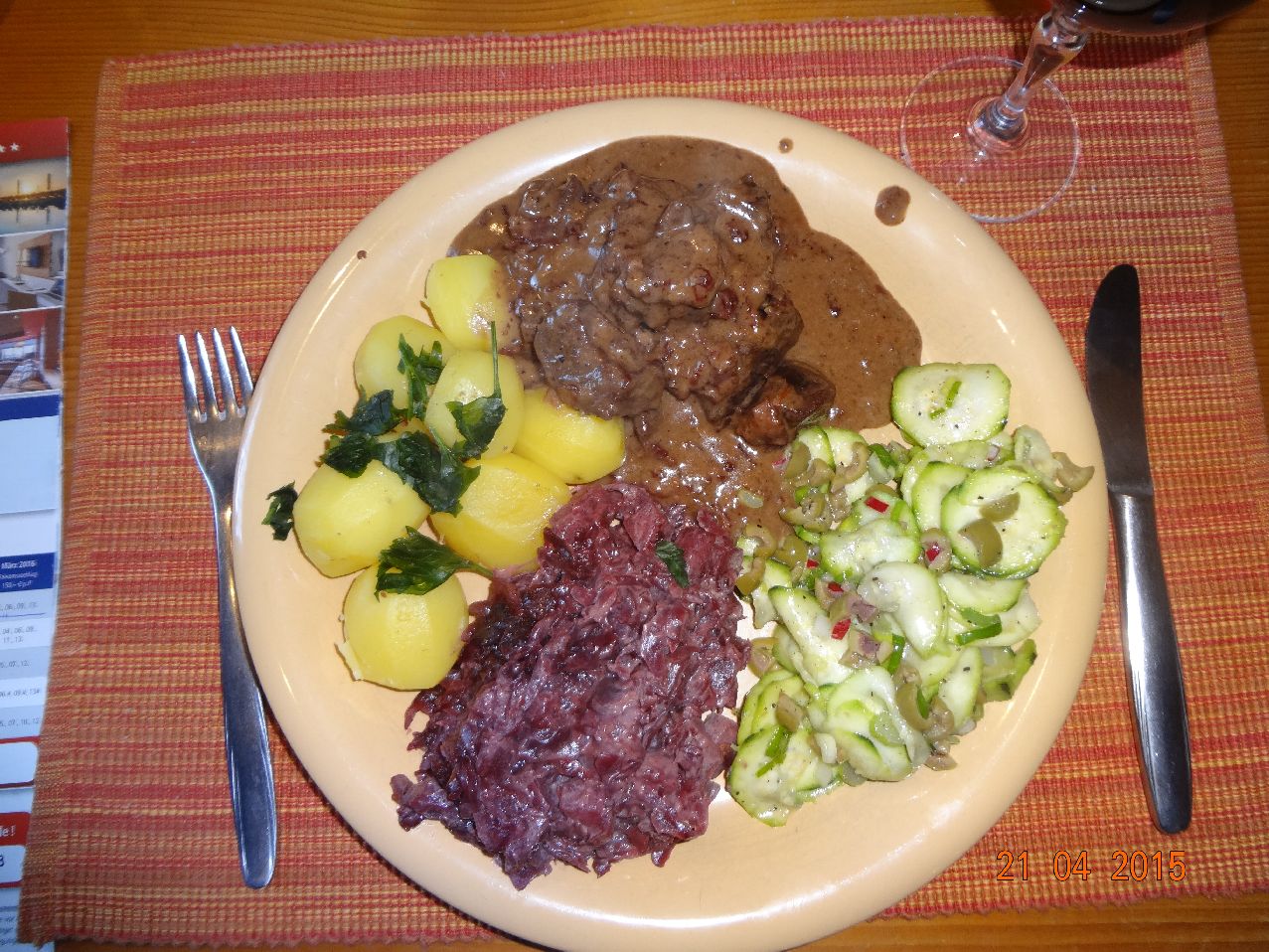 | Hirsch-Gulasch in Rotwein-Soße mit Rotkohl und Rosmarin-Kartoffeln, Zucchini-Salat |
