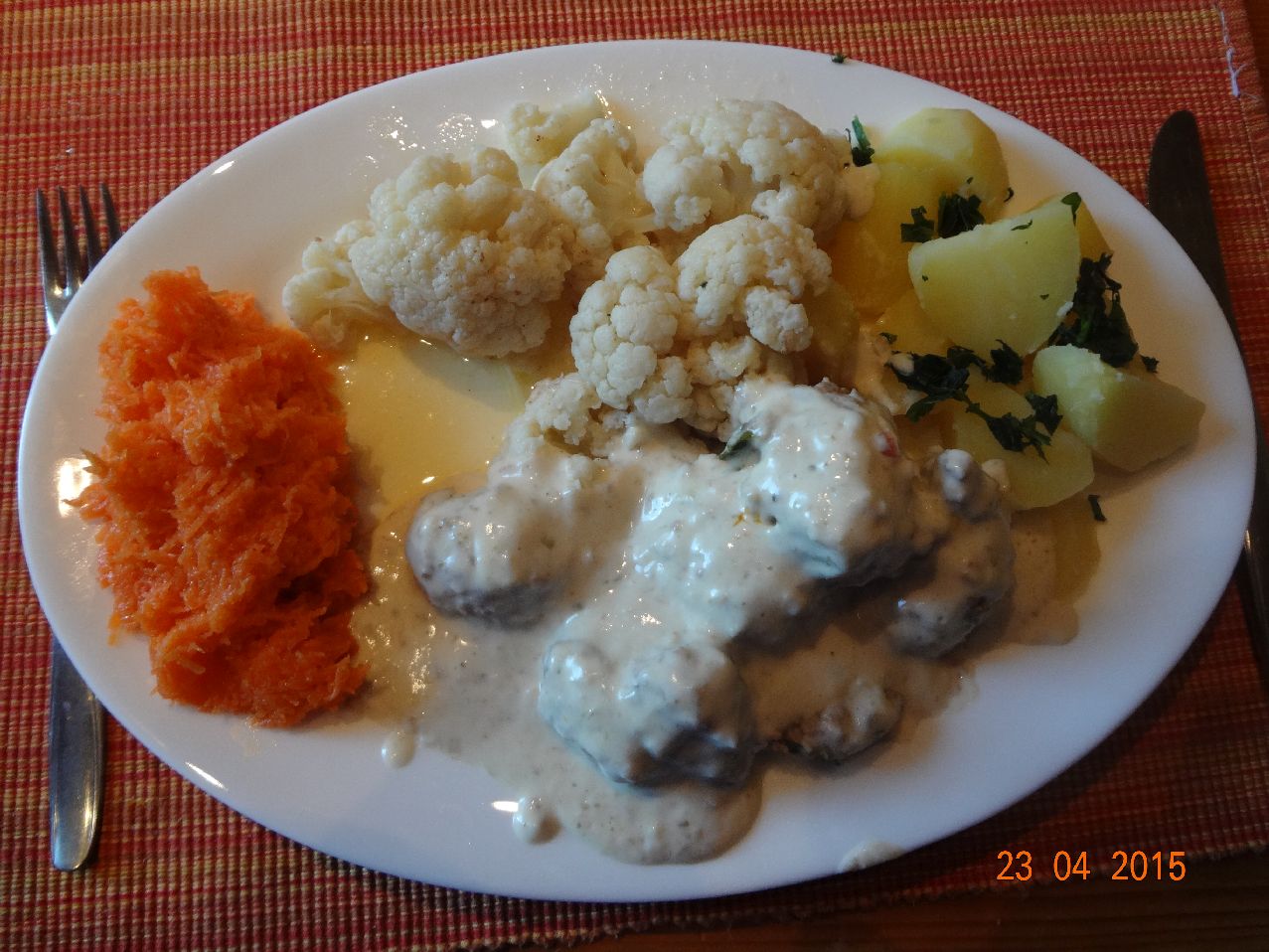 | Königsberger Klopse vom Hirsch mit Blumenkohl und Rosmarin-Kartoffeln, dazu Möhren-Salat |