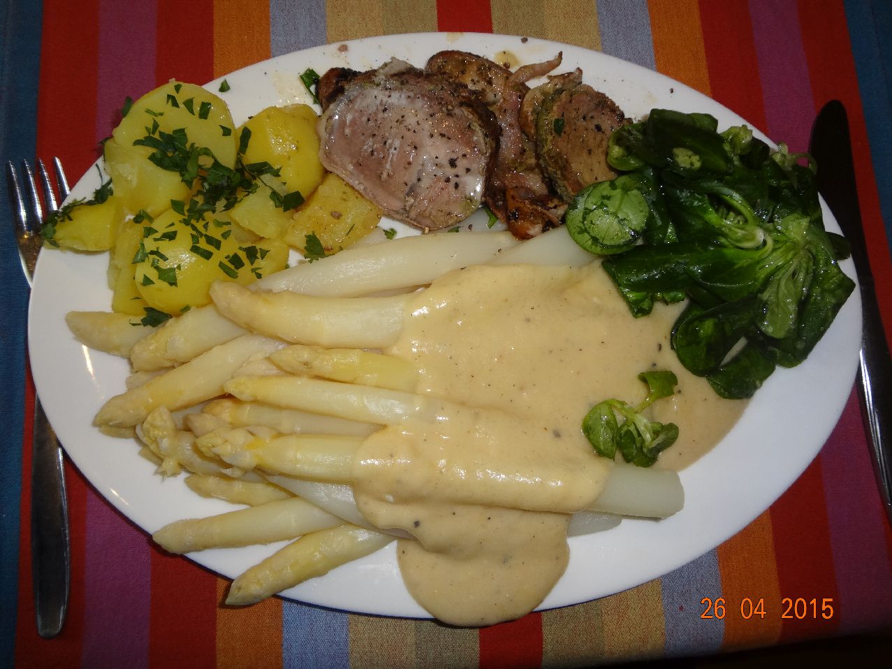 | Spargel mit Soße und Schweins-Filet im Speck-Kräuter-Mantel, dazu Rosm.Kart +Feldslat |