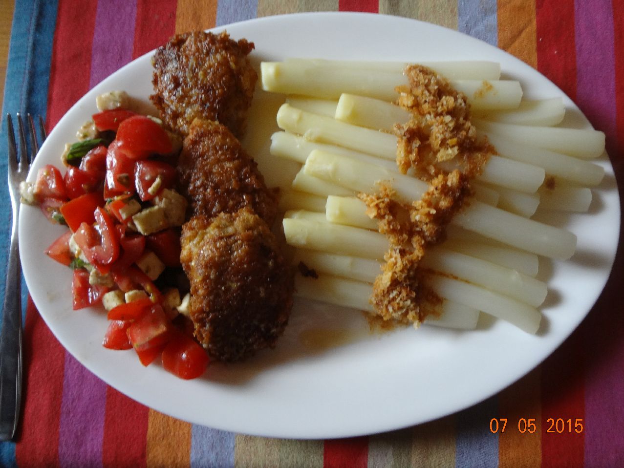 | Spargel mit Butter-Bröseln, Klopse und Tomaten-Salat |