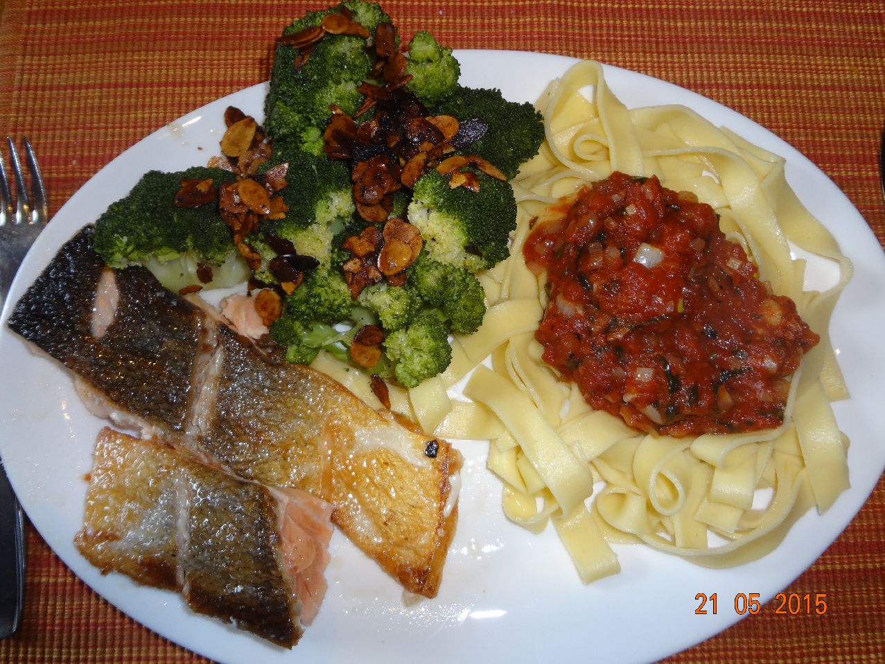 | Lachs-Filet auf Bandnudeln mit Tomaten-Soße und Brokkoli-Röschen |