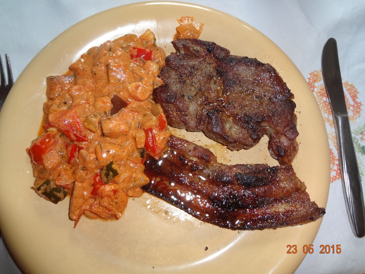 | Steaks, gegrillten Bauchspeck, Ratatui a la Opa, Kräuter-Baguette |