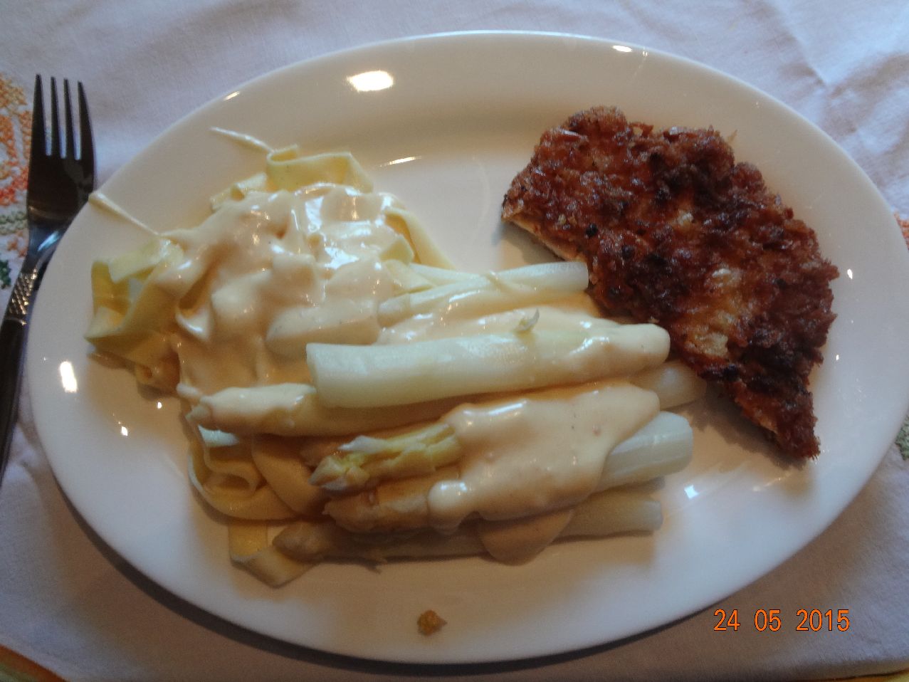 | Hähnchen-Schnitzel, Spargel und Bandnudeln |