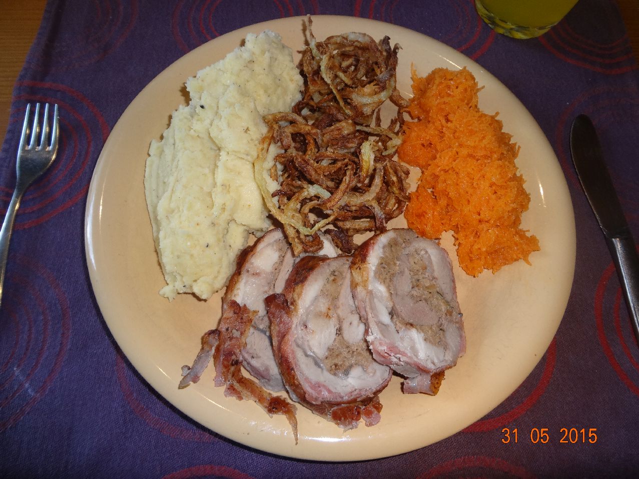 | Mit Lamm-Hack gefülltes Schweine-Filet, fritierte Kohlrabi-Spiralen, Kartoffel-Püree und Möhren-Salat |