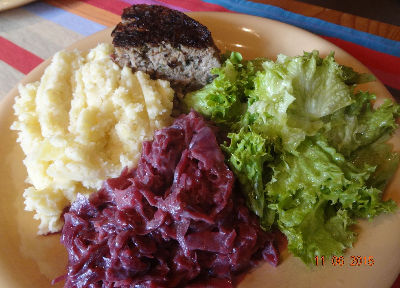 | Lamm-Hack-Braten mit Kartoffel-Püree und Rotkohl |