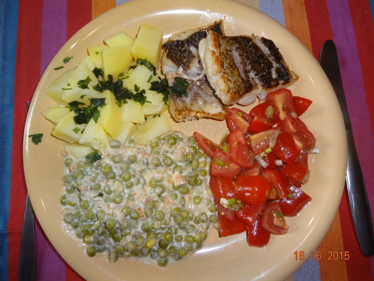 | Fisch-Filet mit sehr feinen grünen Erbsen in Weißwein-Rahm-Soße mit Rosmarin-Kartoffeln und Tomaten-Salat |