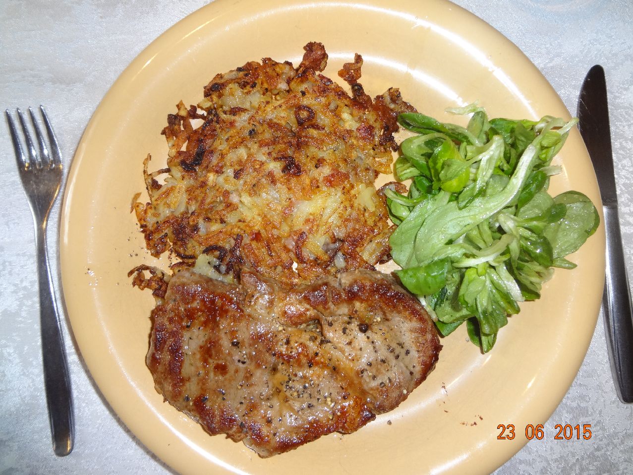 | Nacken-Steak mit Rösti und Feld-Salat |