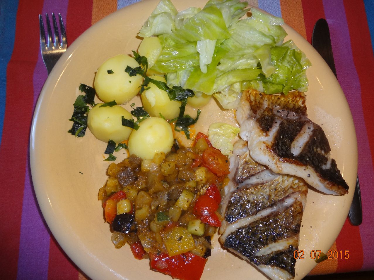 | Makrelen-Filet Müllerin auf Ratatouille-Spiegel und Eisberg-Salat |
