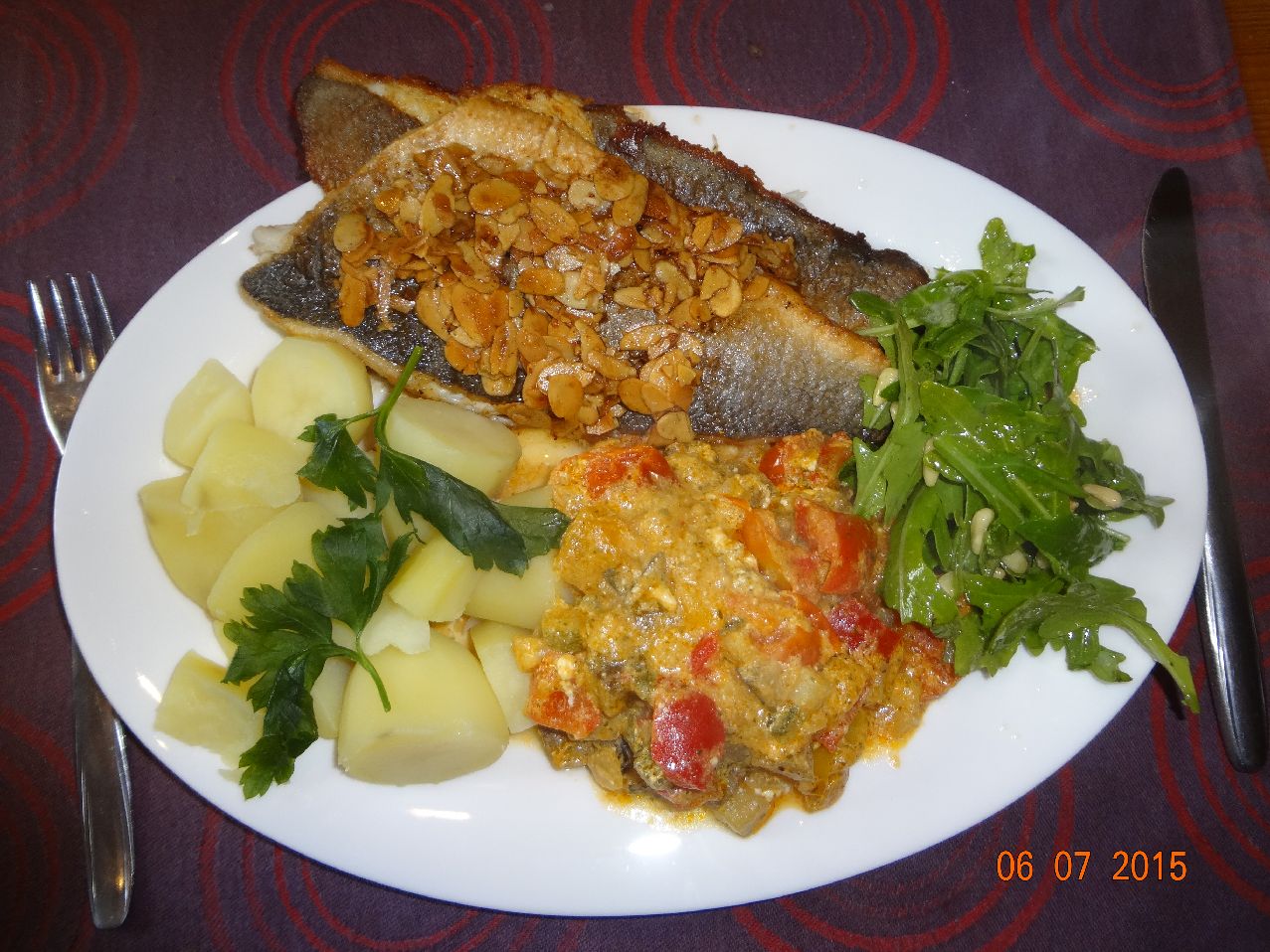 | Gebratenes Wolfsbarsch-Filet mit Mandel-Splittern, Pfannen-Gemüse, Rosm-Kart, Rukola-Salat |