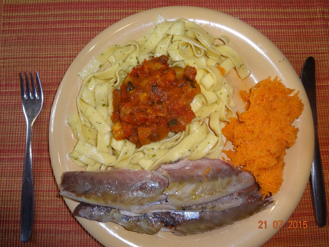| Selbstgeräucherte Makrele mit Nudeln und Pfannen-Gemüse, Möhren-Salat |