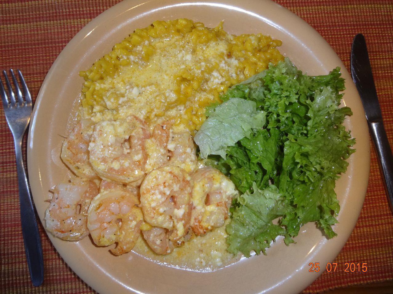 | Safran-Risotto mit Garnelen-Spießen(*) und Orangen-Sahne-Sosse(*)+Lollo Bionda |