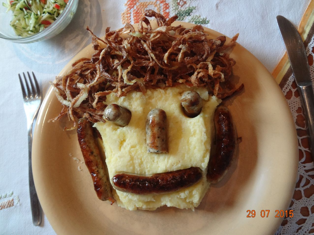 | Gesicht aus Kartoffel-Brei, Würstchen und gegrillten Kohlrabi-Spiralen |