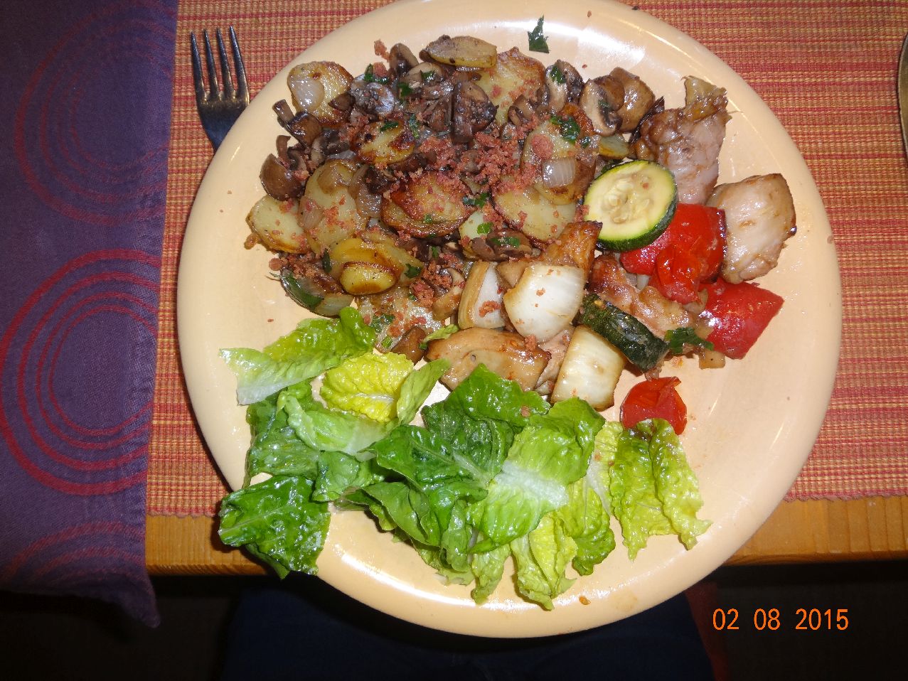 | Gemüse-Hähnchen-Spieße mit Bratkartoffeln und Pilzen, Mini-Romana-Salat |
