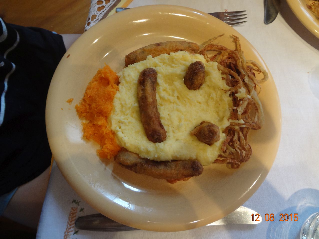 | Gesicht mit Würstchen im Schlafrock, gegrillten Kohlrabi-Spiralen, Kartoffel-Püree und Möhren-Salat |
