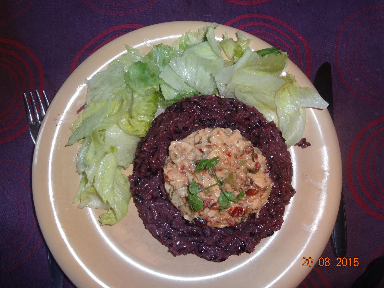 | Lachs und Räucherlachs in mediterraner Sahne-Sekt-Sosse mit schwarzem Pimont- und Basmati-Reis |