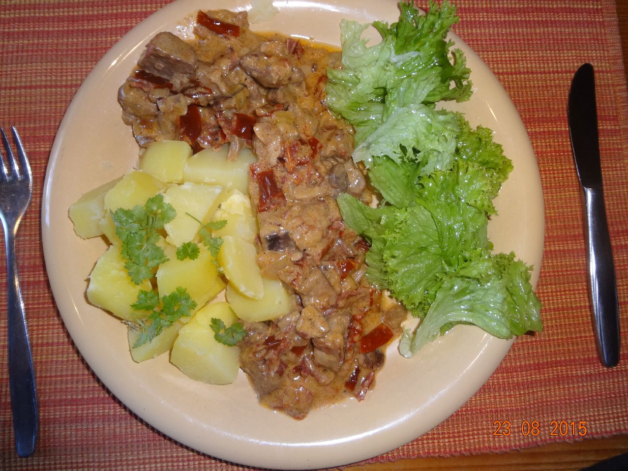 | Schweine-Gulasch in Pilz-Soße mit Stauden-Sellerie, Petersilien-Kartoffeln und Mini-Romana-Salat |