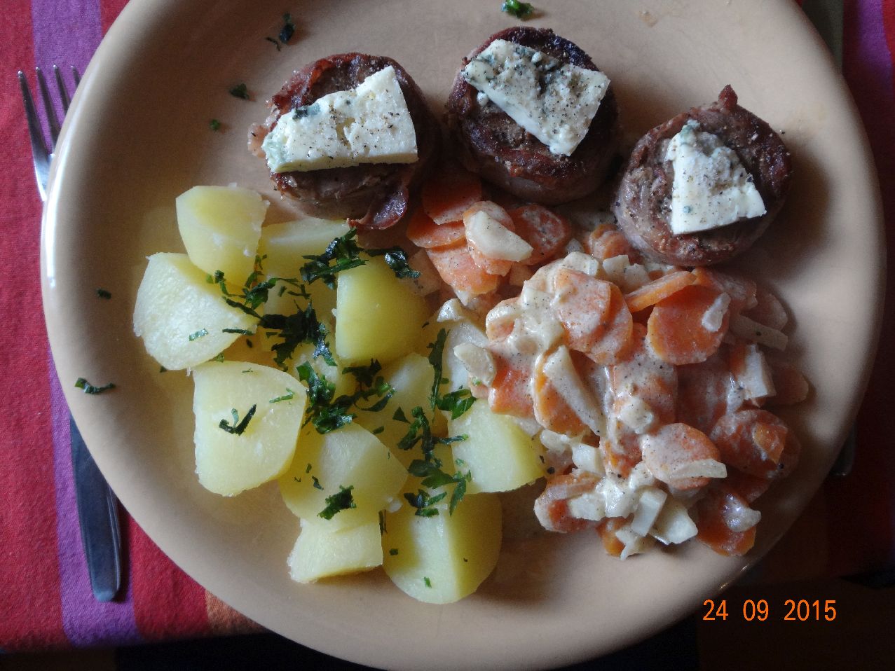 | Ummantelte Schweine-Filet-Medaillons mit Edelpilzkäse, Vanille-Möhren und Rosmarin-Kartoffelln |