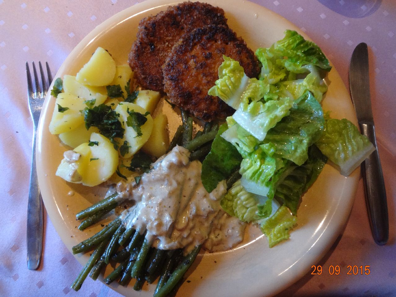 | Frikadellen vom Wagyu-Rind, Grüne Bohnen, Edelpilzkäse-Soße und Rosm.-Kart. |
