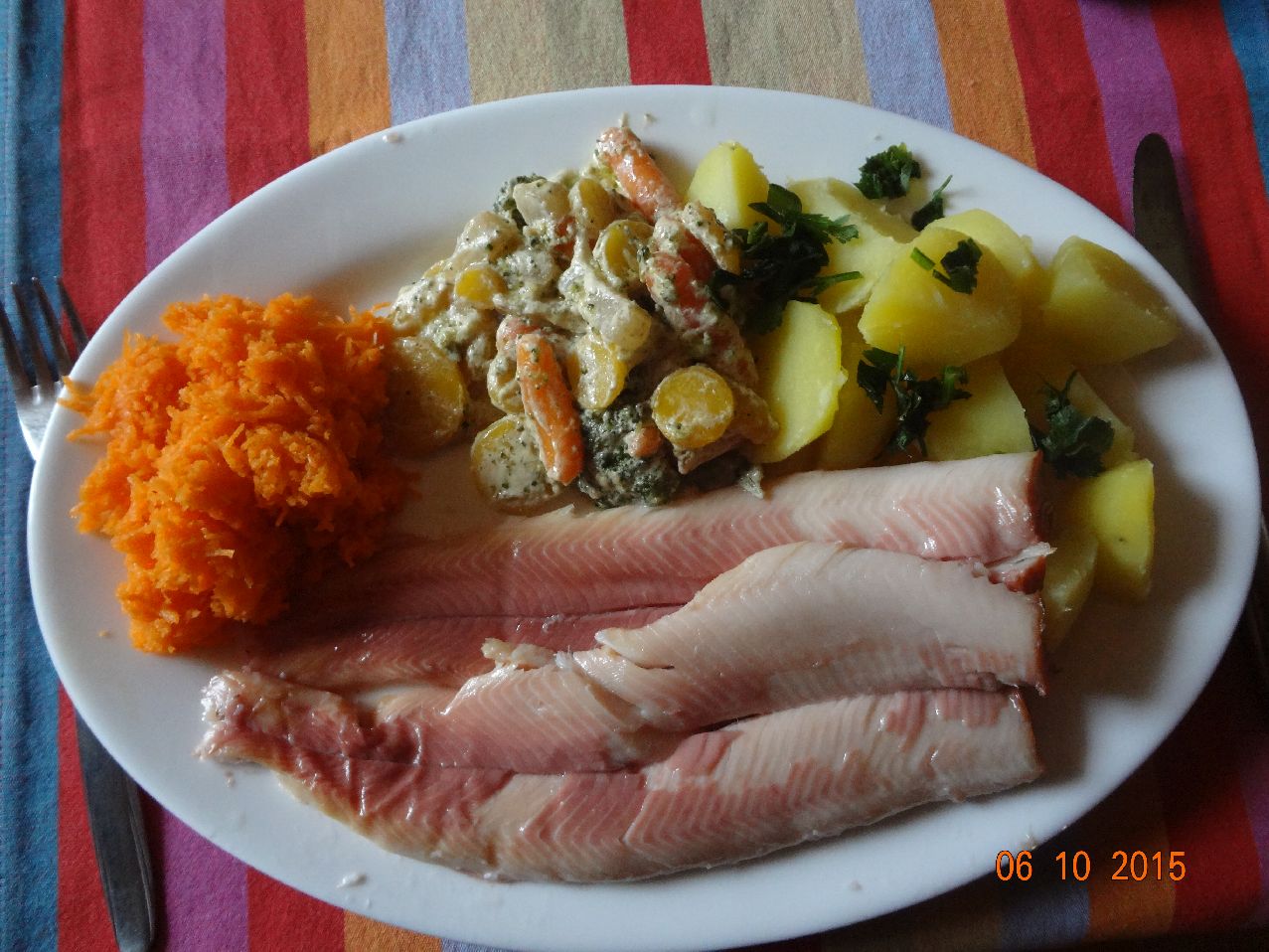 | Gemüse-Bratkartoffeln mit eingelegtem Brathering, Möhren-Salat |