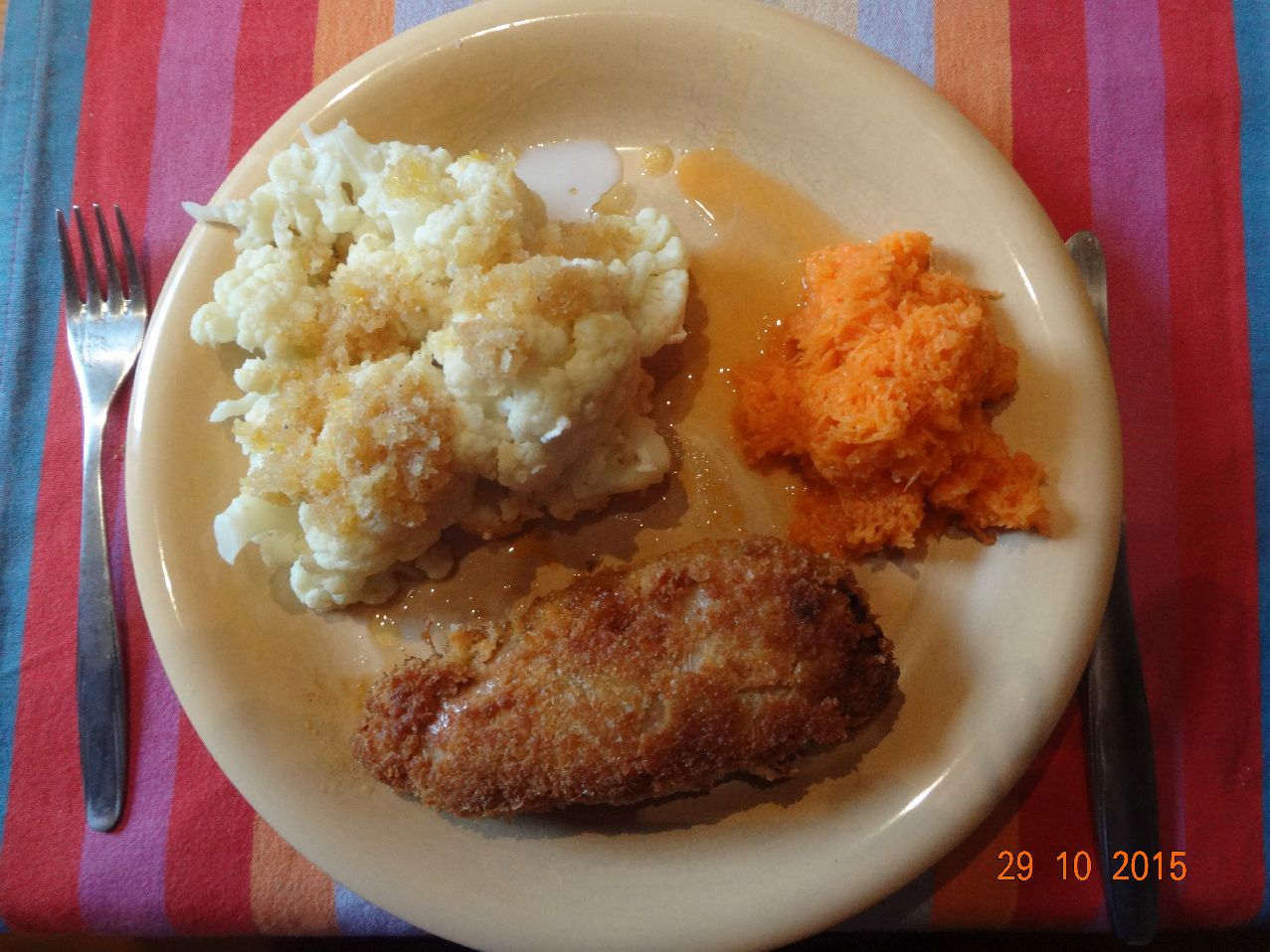 | Hähnchen-Schnitzel, Blumenkohl, Möhrensalat |