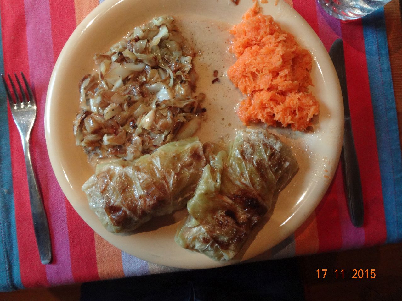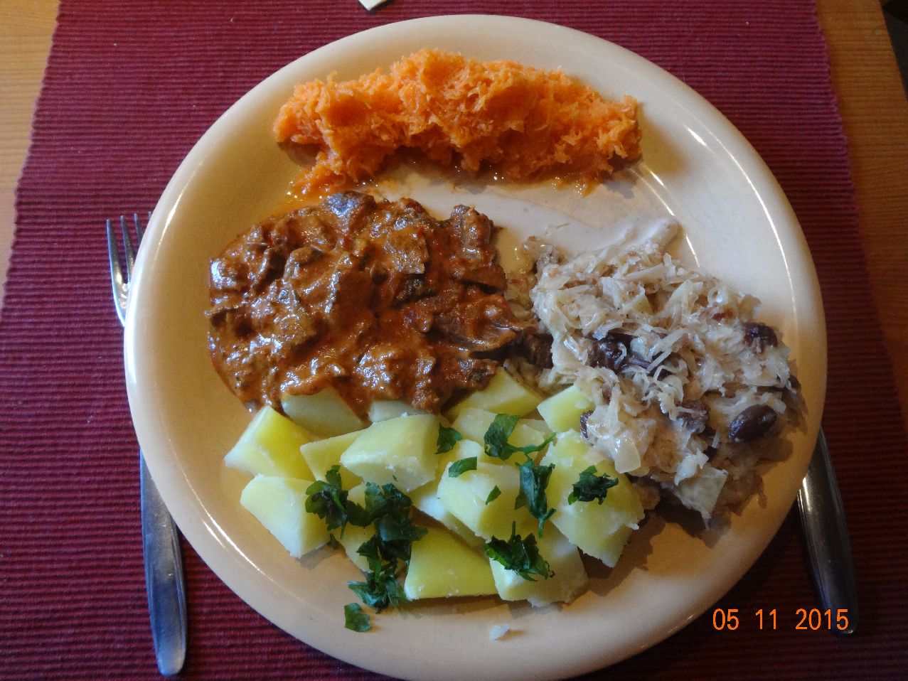 | Reste-Essen: Rouladen, Sauerkraut mit Rum-Rosinen, Möhren-Salat |