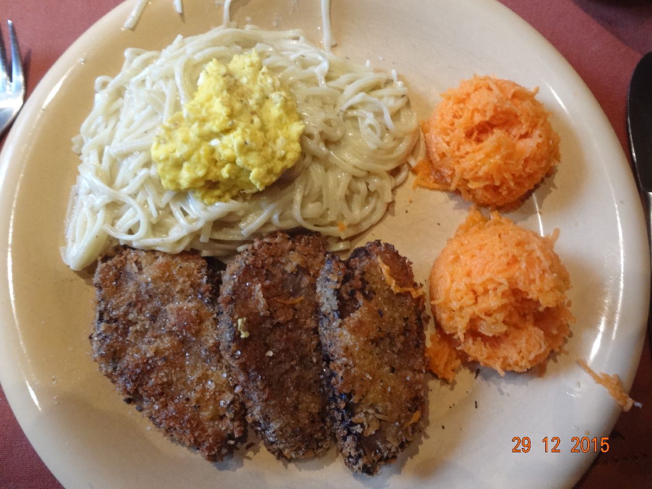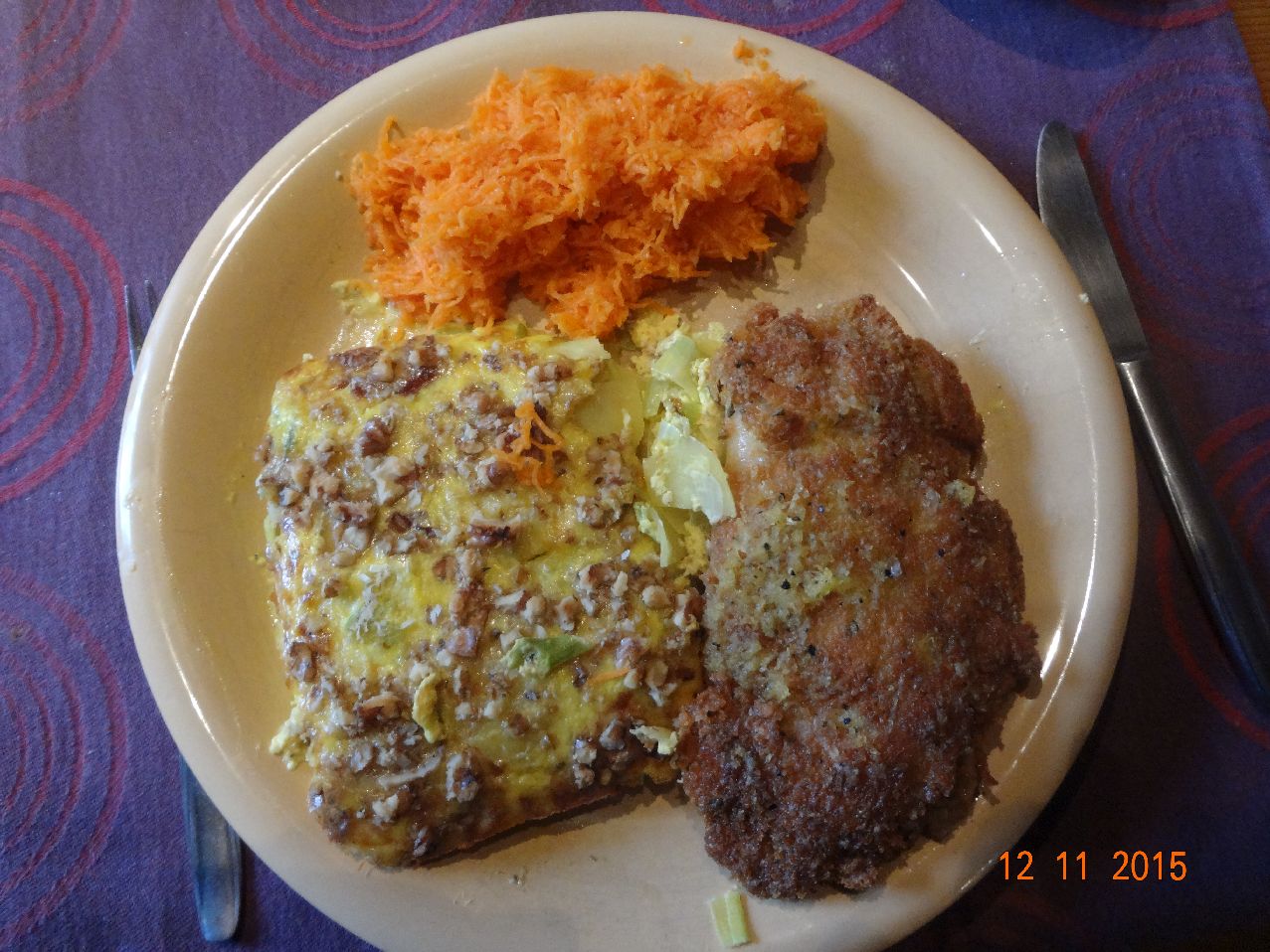 | Panierte Enten-Brust mit Schnitt-Nudeln und Möhren-Salat |