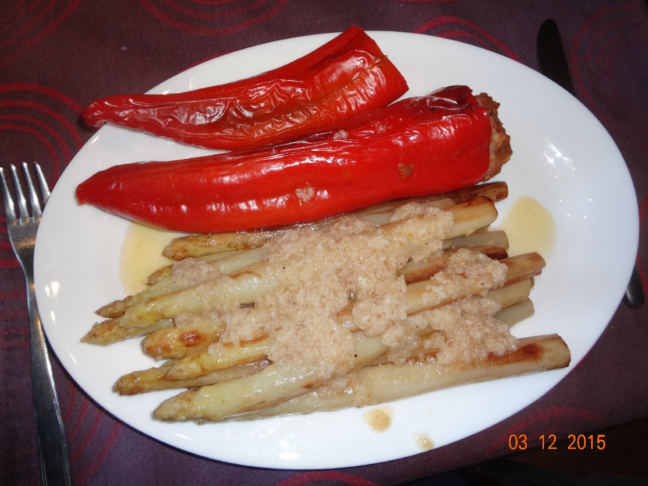 | Mit Kalb-Fleisch-Resten gefüllte Paprika und gebratener Spargel |