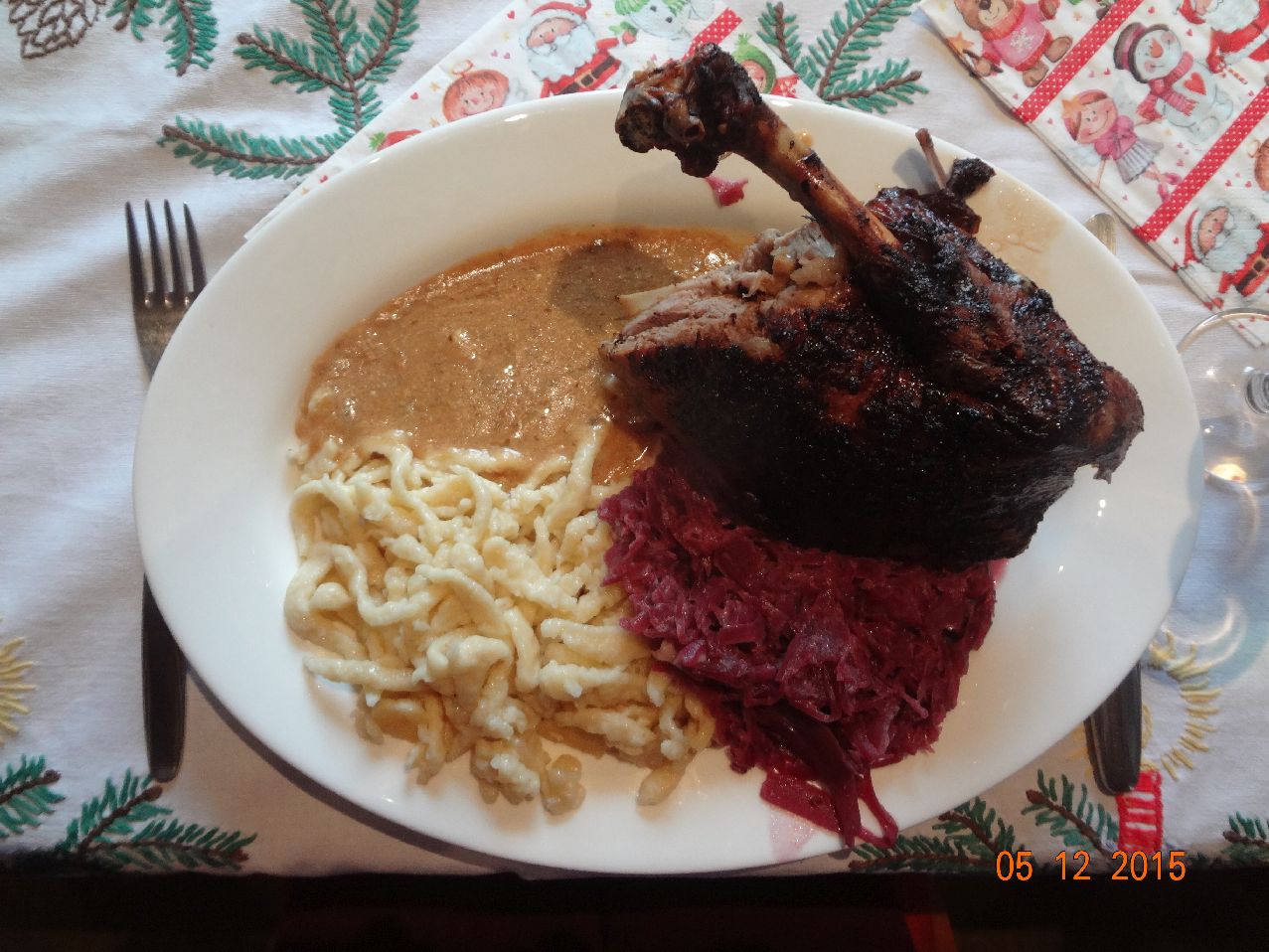 | Orangen-Ente, Rotkohl, Spätzle und Eisberg-Salat |
