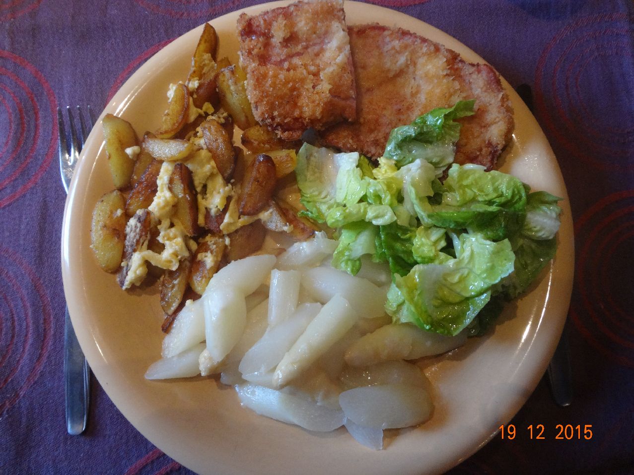 | Panierte Kasseler-Scheiben, gebratene Kartoffel-Spalten und Spargel in Butter-Zitronen-Marinade, Salat-Herzen |