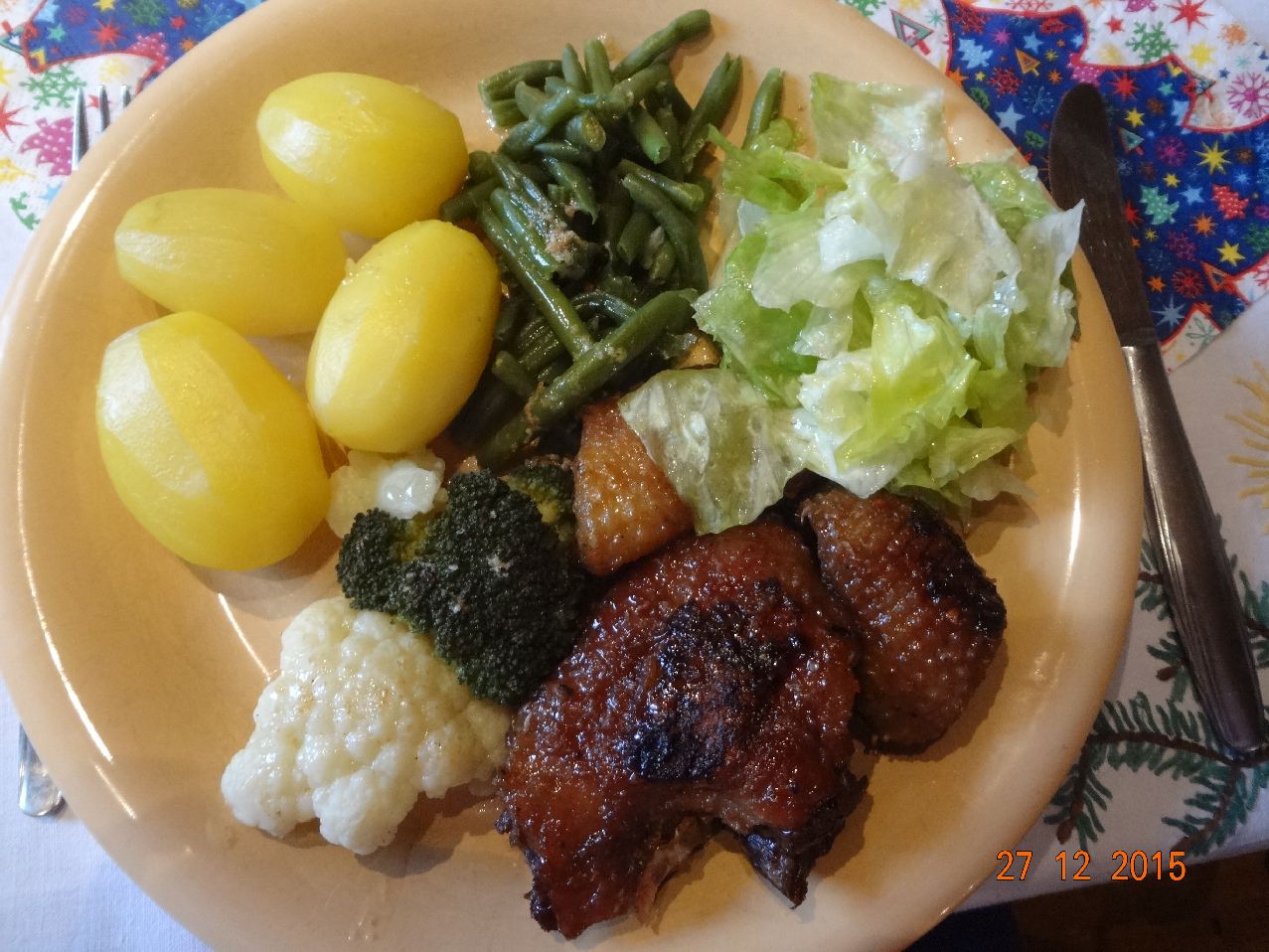 | Enten-Flügel-Schenkel mit grünen Bohnen, Blumenkohl, Kartoffeln und Soße |
