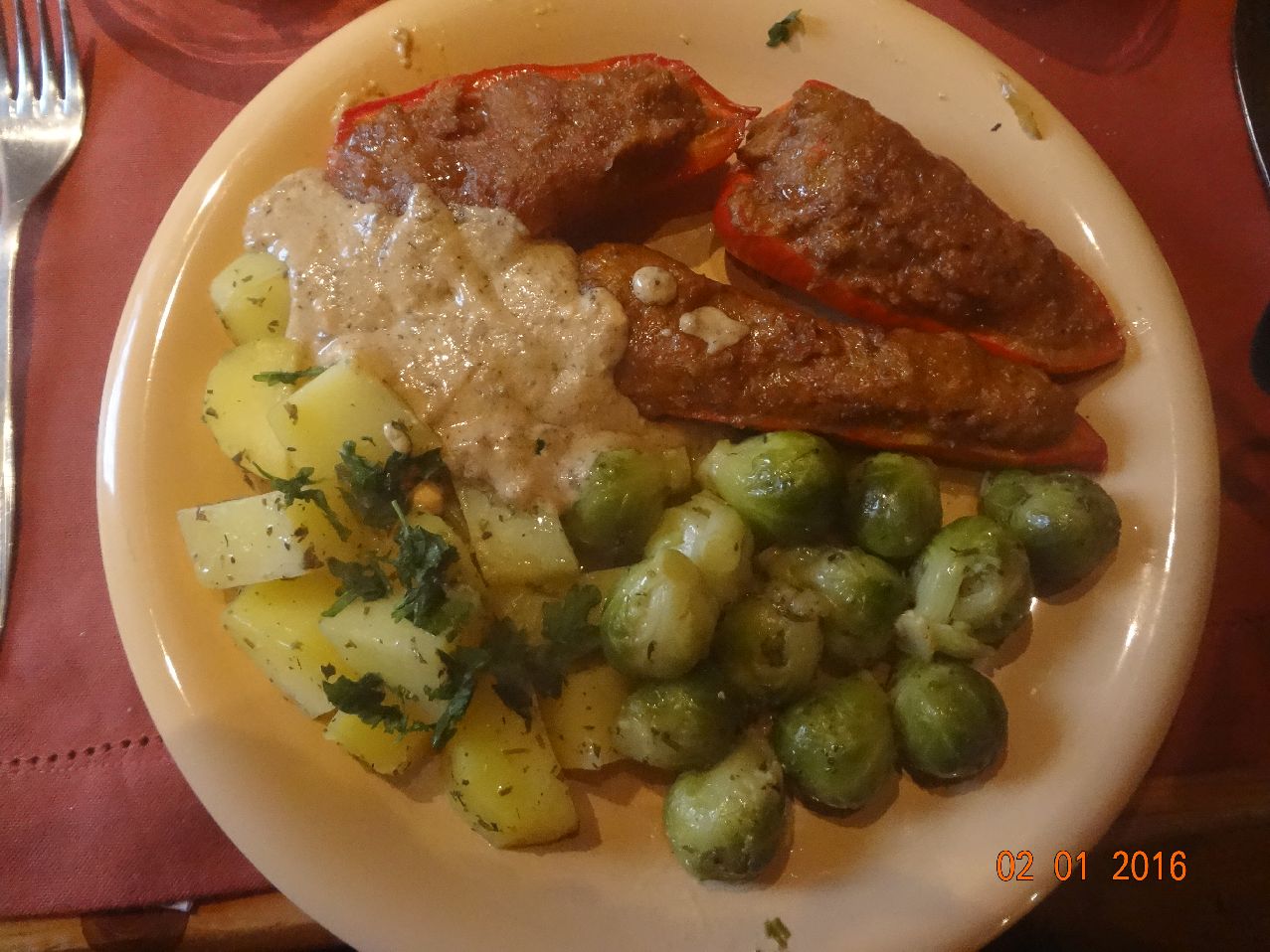 Gefüllte halbe Paprika, Rosenkohl, Rosm.-Kart., Soße |
