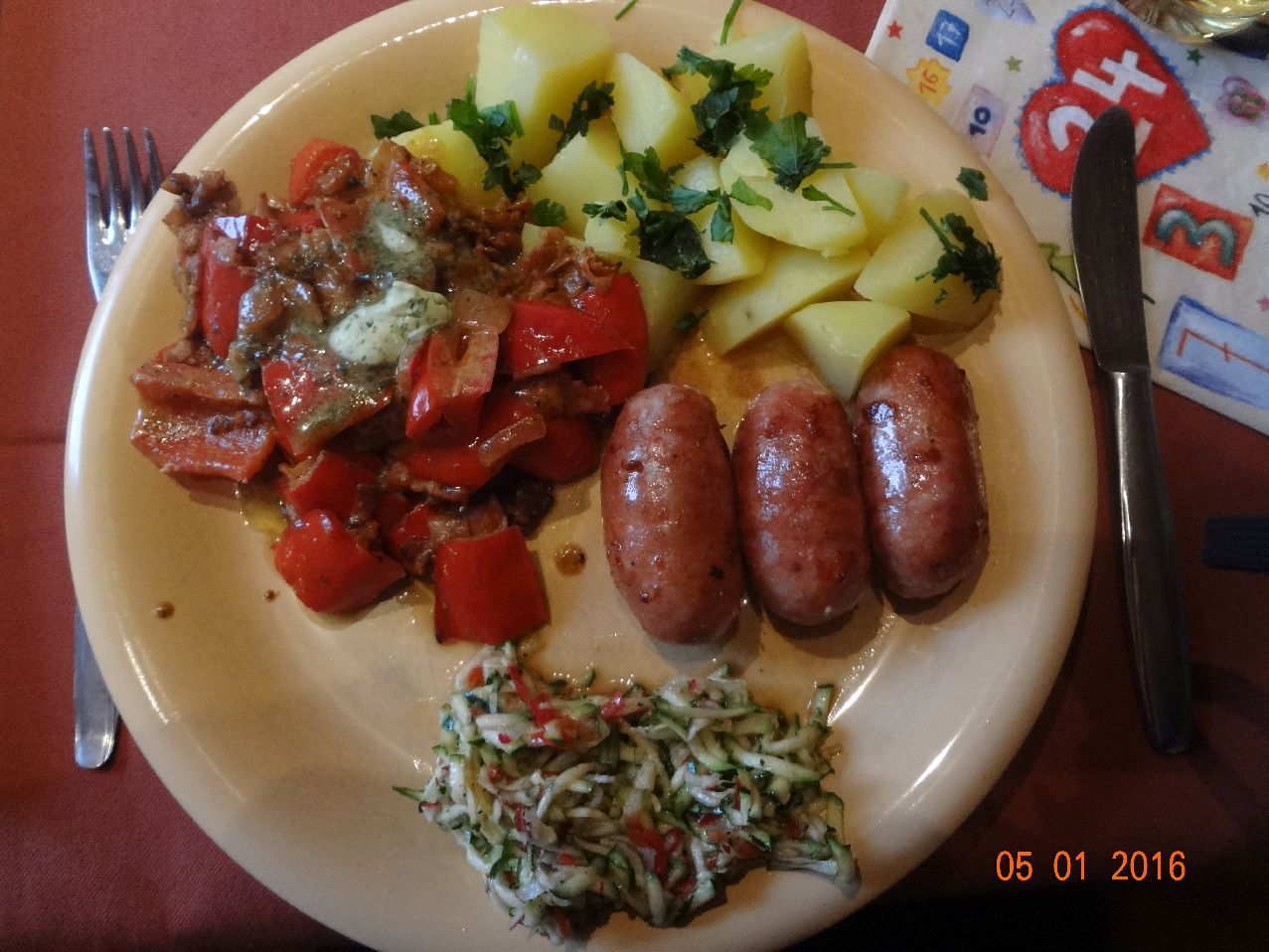 | | Salsiccia, Paprika-Gemüse, Rosm.-Kart., Zucchini-Paprika-Salat |