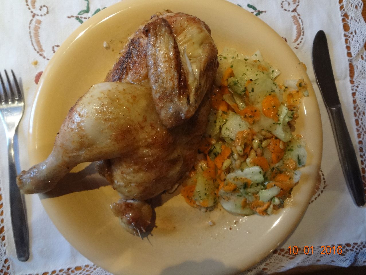 | | Gegrilltes Hähnchen, Kohlrabi-Möhrensalat mit Pinien-Kernen |