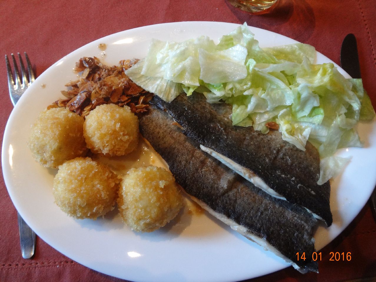 | | Forelle Müllerin mit Kartoffel-Knödeln, Eisbergsalat |