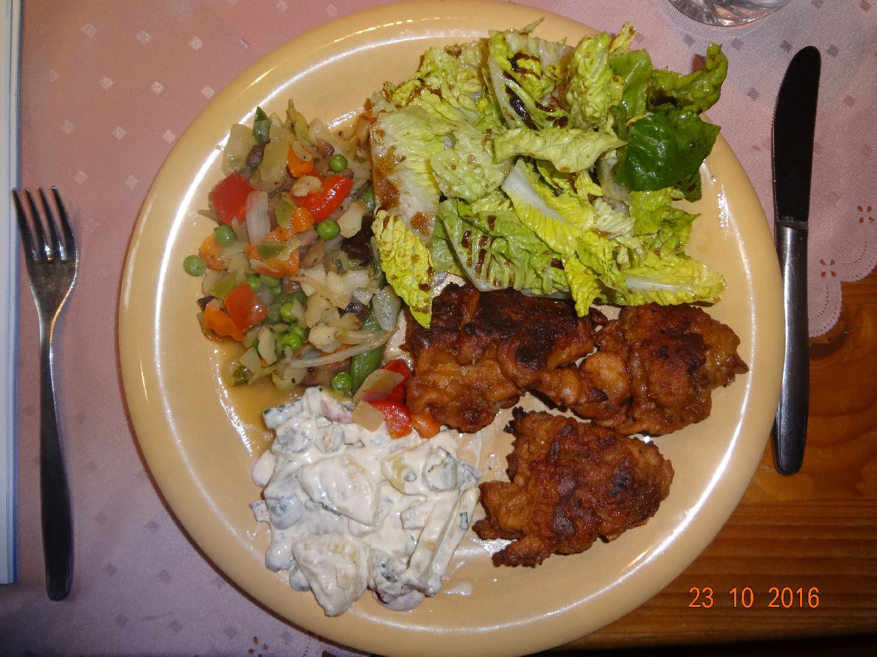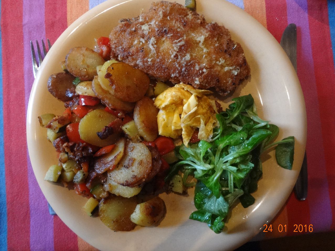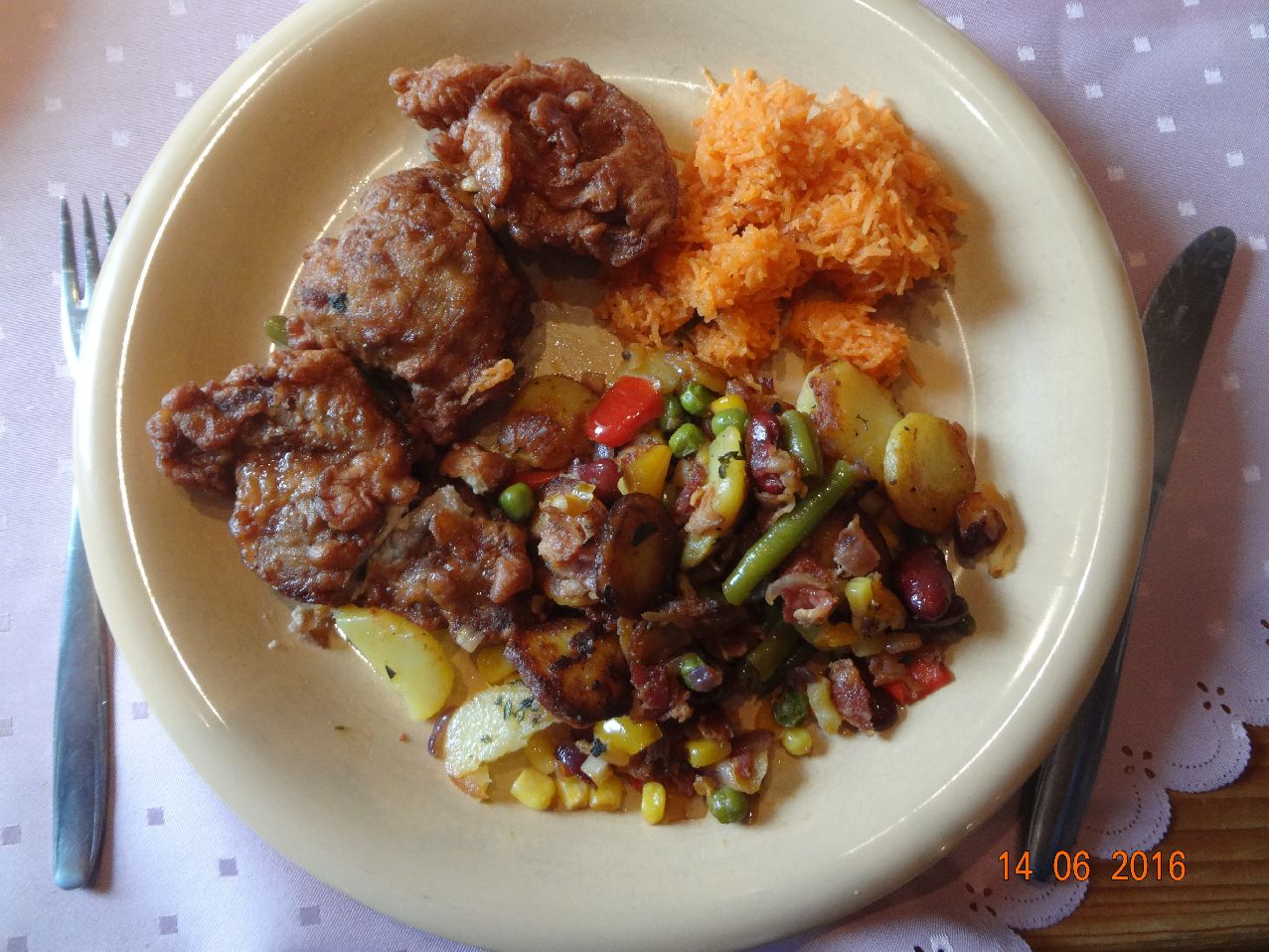 | | Bratkartoffeln mit mexikanischem Pfannen-Gemüse, Hähnchen, Nacken-Steak im Schlafrock, Möhrensalat |