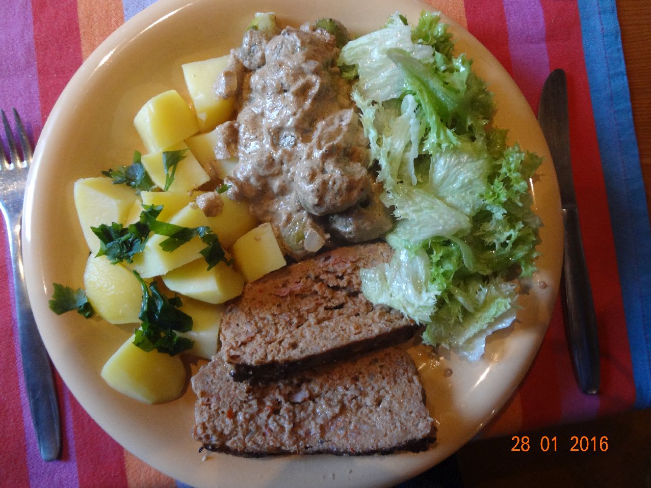 | | Hack-Braten mit Kartoffel-Kohlrabi-Würfeln, Tomaten-Paprika-Zucchini-Salat |