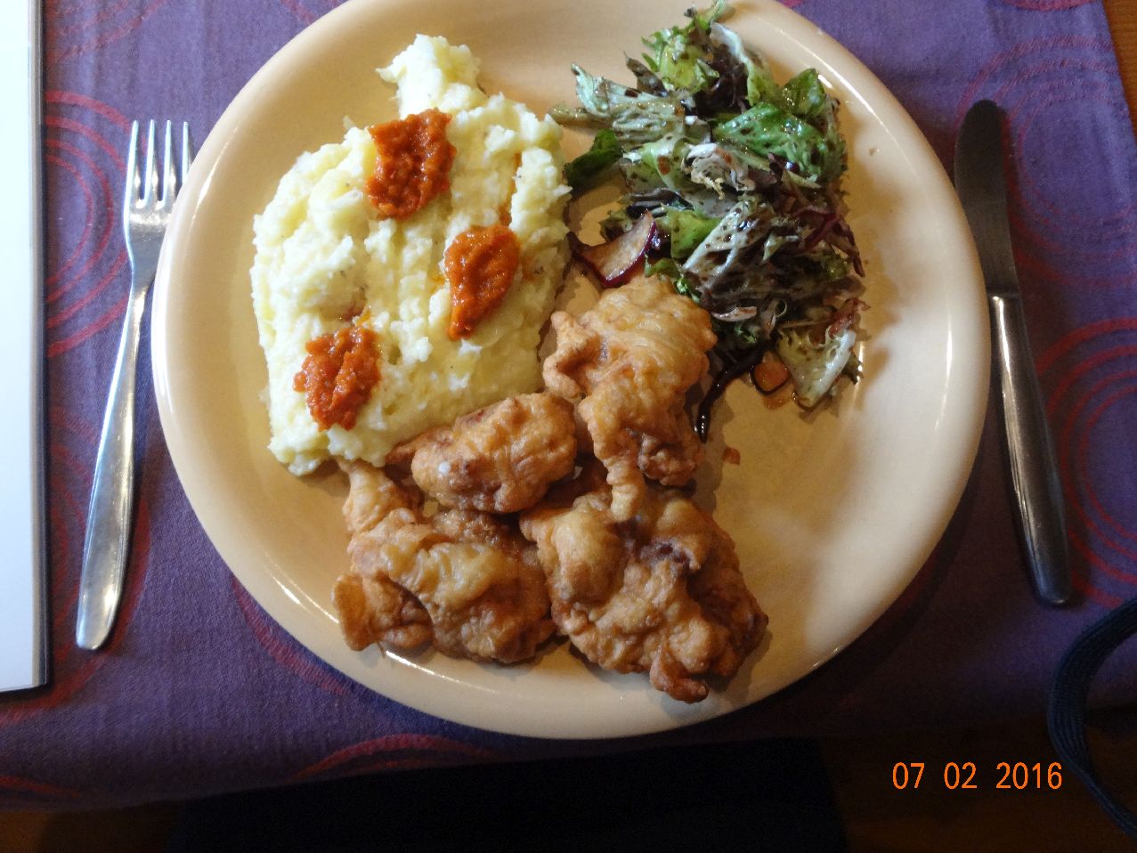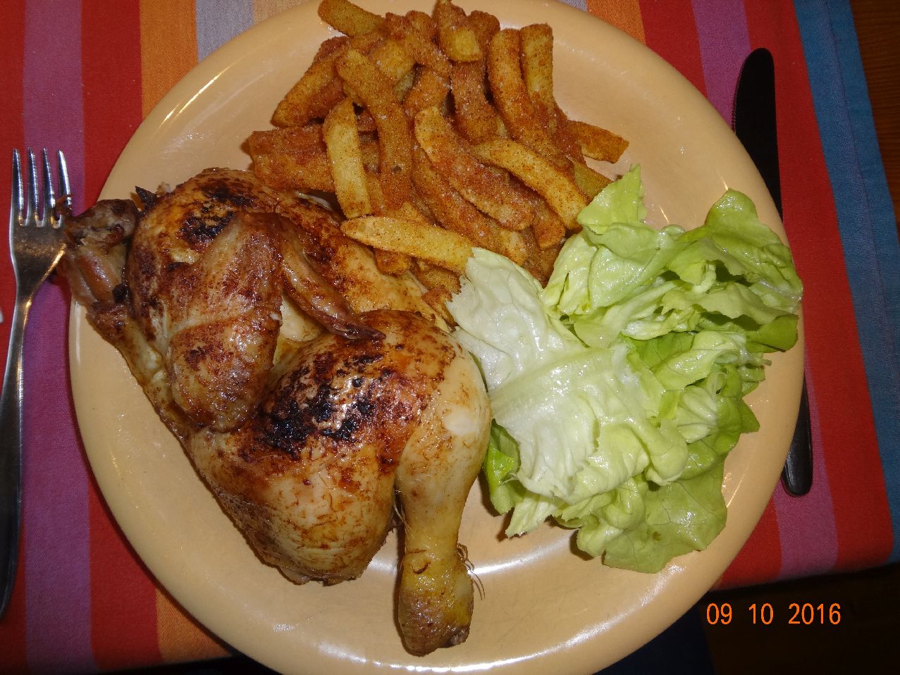 | | Gegrilltes Maishähnchen, Pommes frites (mit Chips-Panade), Kopfsalat |