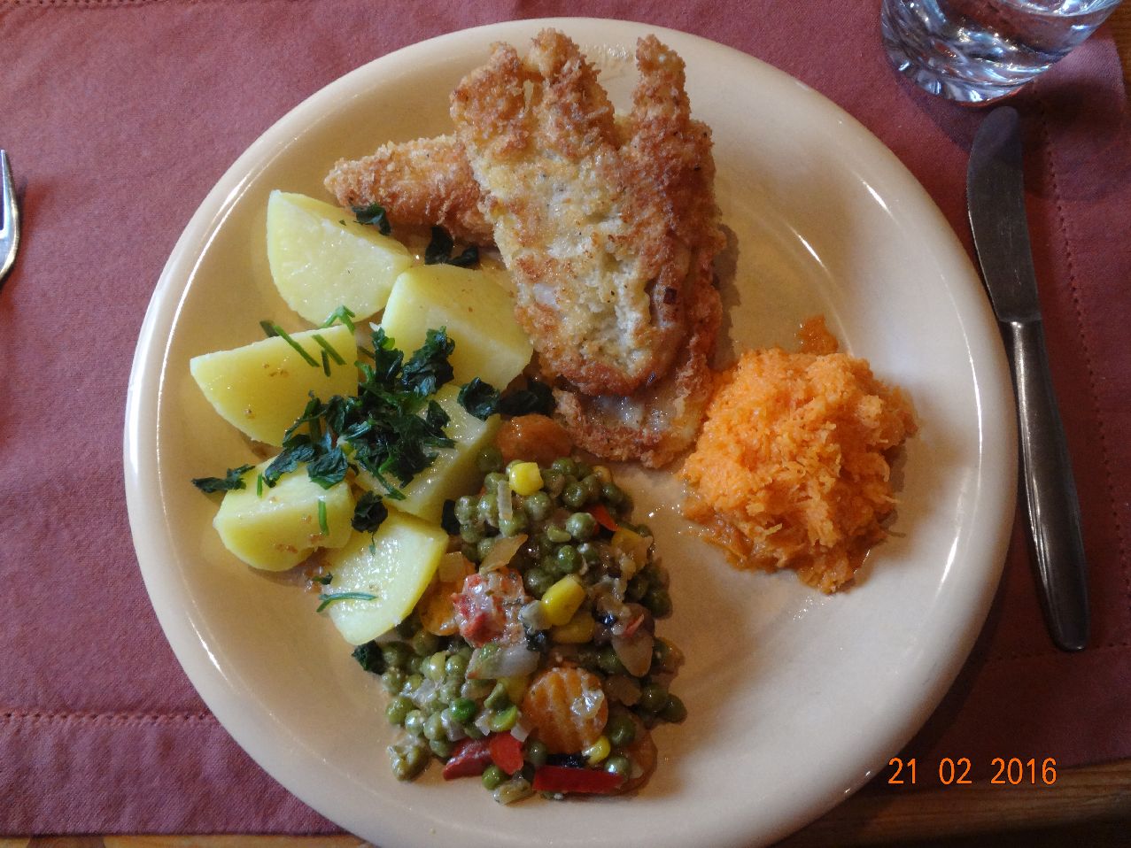 | | Backfisch mit Pfannen-Gemüse, Rosm.-Kart., Möhrensalat |