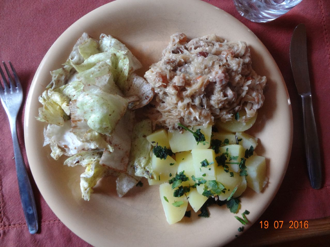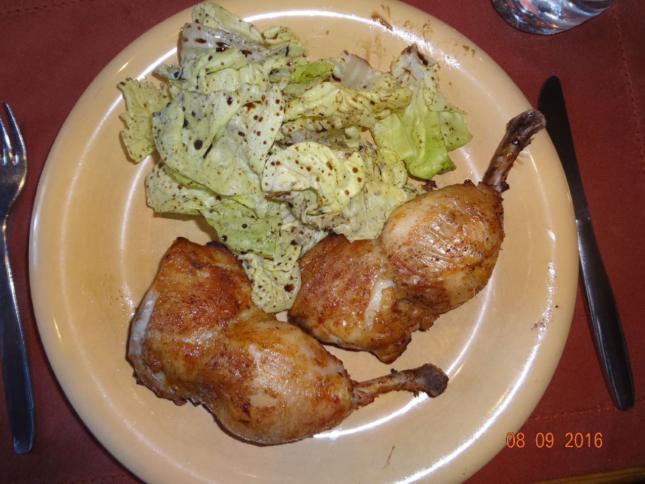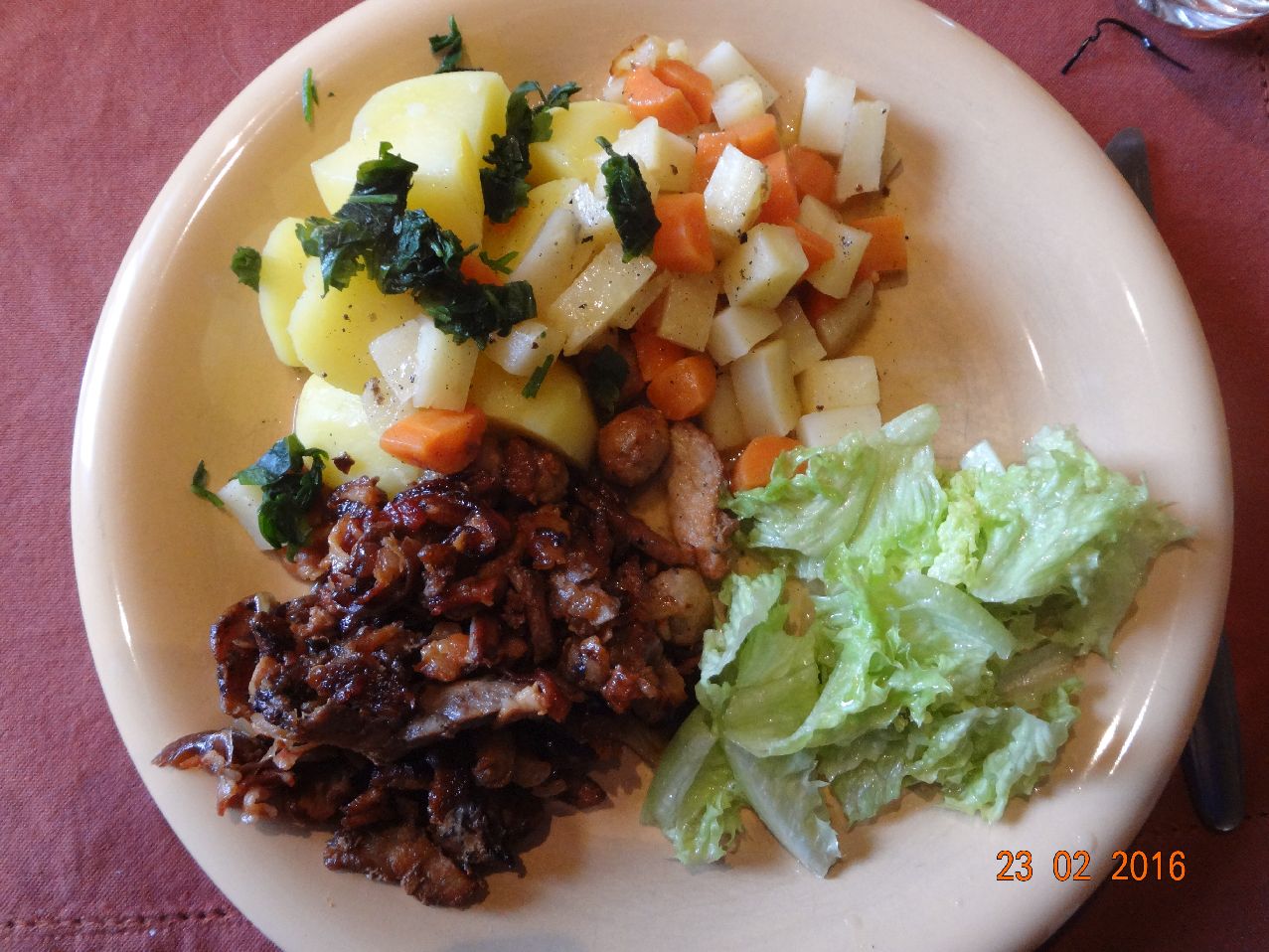 | | Enten-Keule, Rotkohl, Petrsilien-Karoffeln, Eisbergsalat |