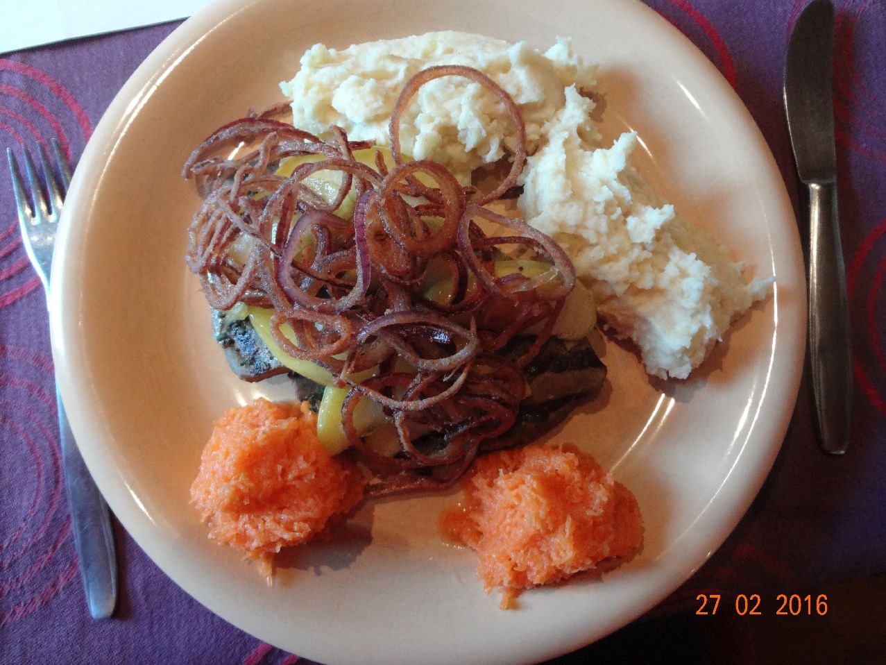 | | Rinder-Leber mit karamelisierten Äpfeln und Röstzwiebeln, Kart.-Stampf, Möhrensalat |