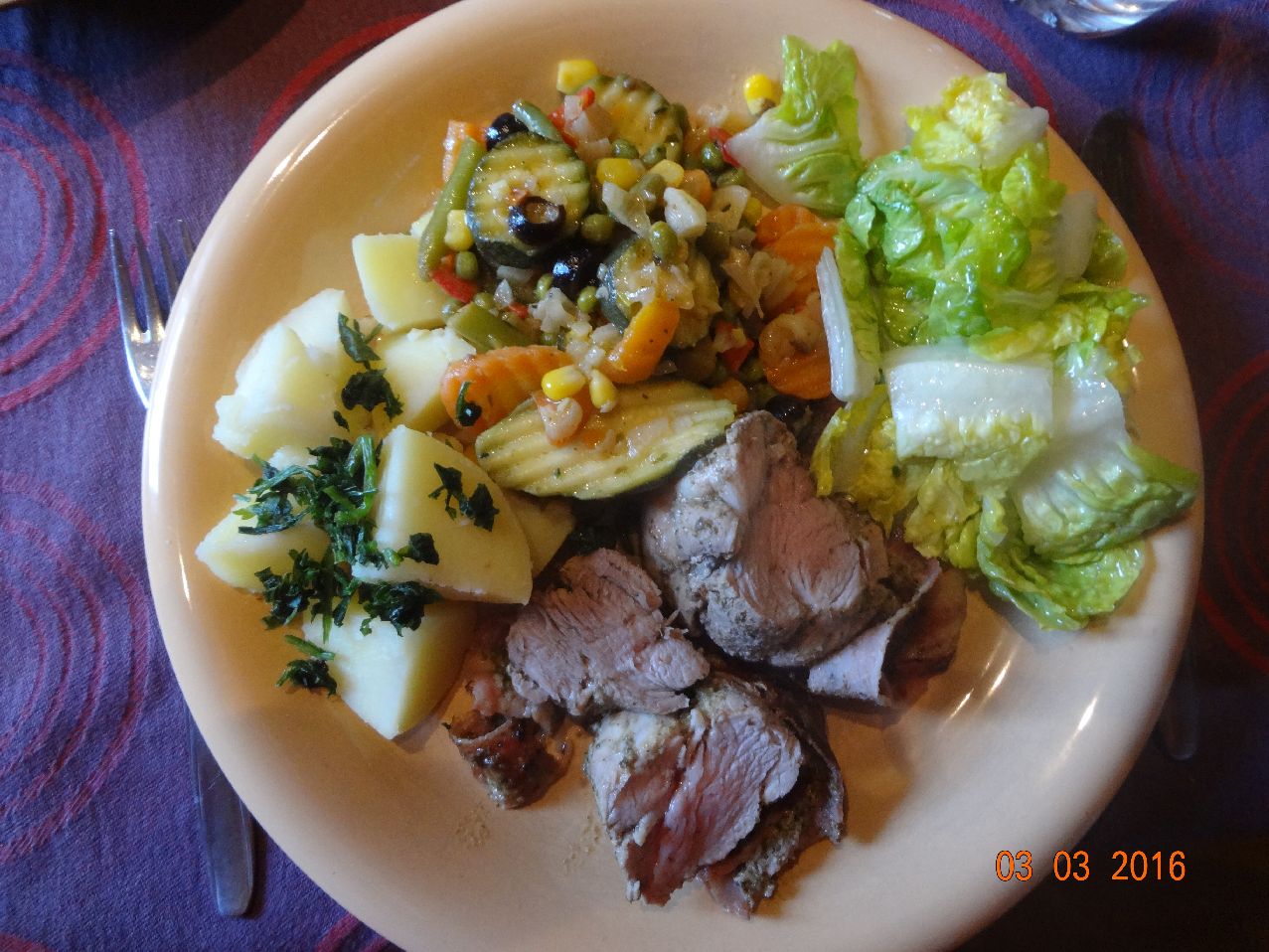 | | Schweine-Filet-Geschnetzeltes mit Pilzen, Mischgemüse, Pet.-Rosm.-Kart., Eisbergsalat |