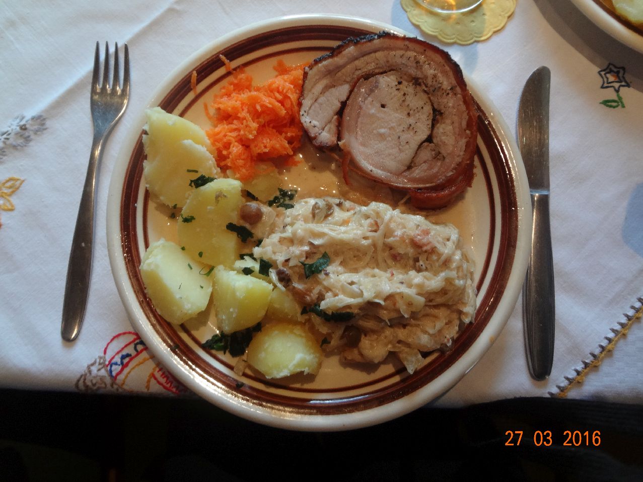 | | Spanferkel-Rollbraten, Sauerkraut mit Rum-Rosinen, Rosm.-Kart., Möhrensalat |
