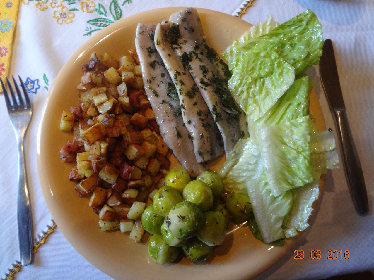 | | Gebratene Kartoffel-Würfel, gedünsteter Rosenkohl, Matjes-Kräuter-Filets, Salat |