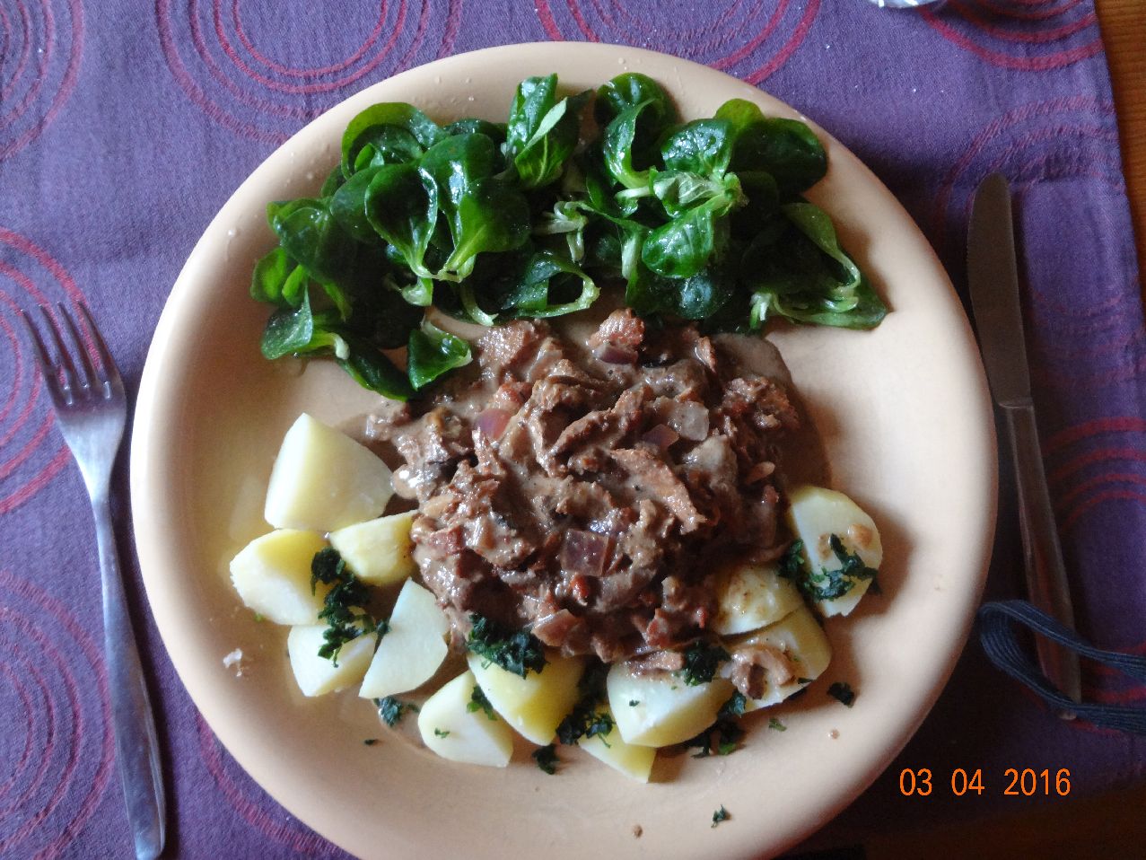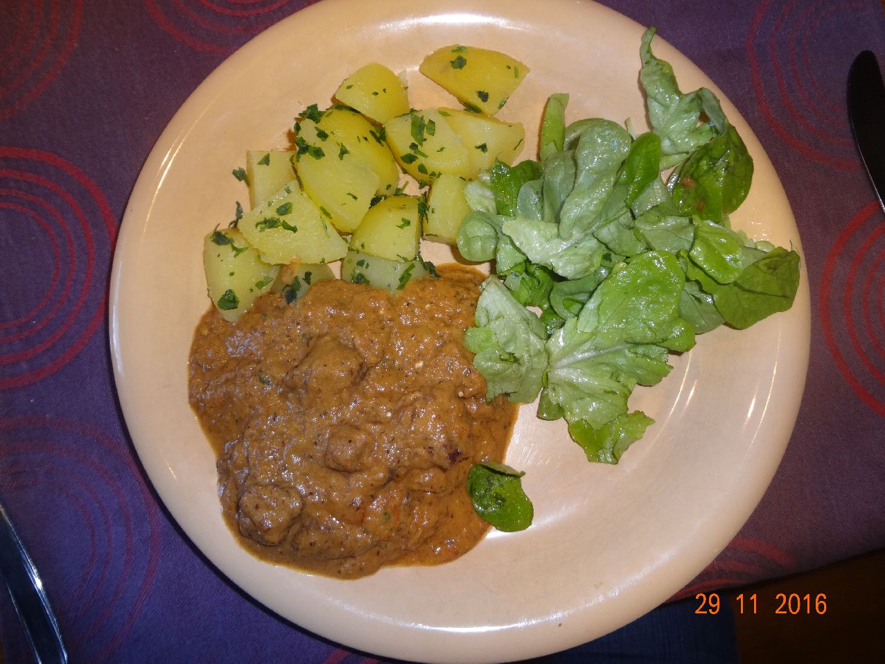 | | Rinder-Gulasch mit Pet.-Kart., Salanova-Salat |