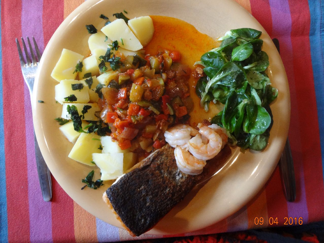 | | Gebratenes-Lachs-Filet mit Garnelen, Ratatouille, Pet.-Kart., Feldsalat |