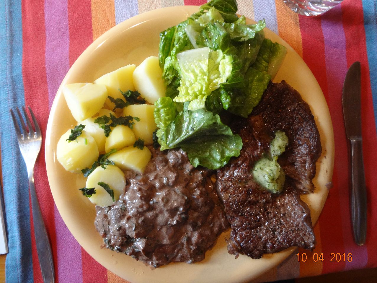 | | Nacken-Steak mit Kräuter-Butter, Kartoffel-Wirsing-Gemüse, Feldsalat |