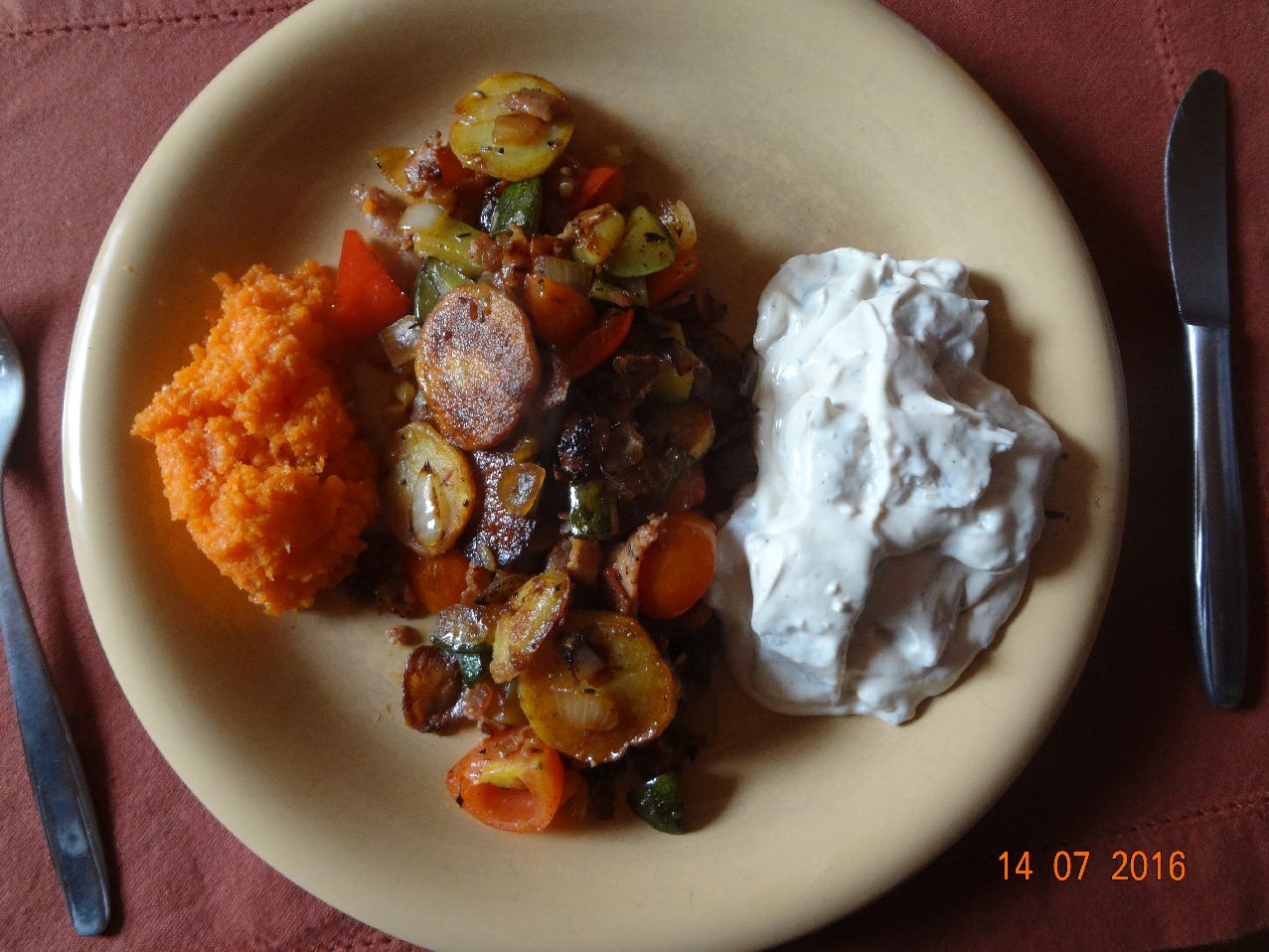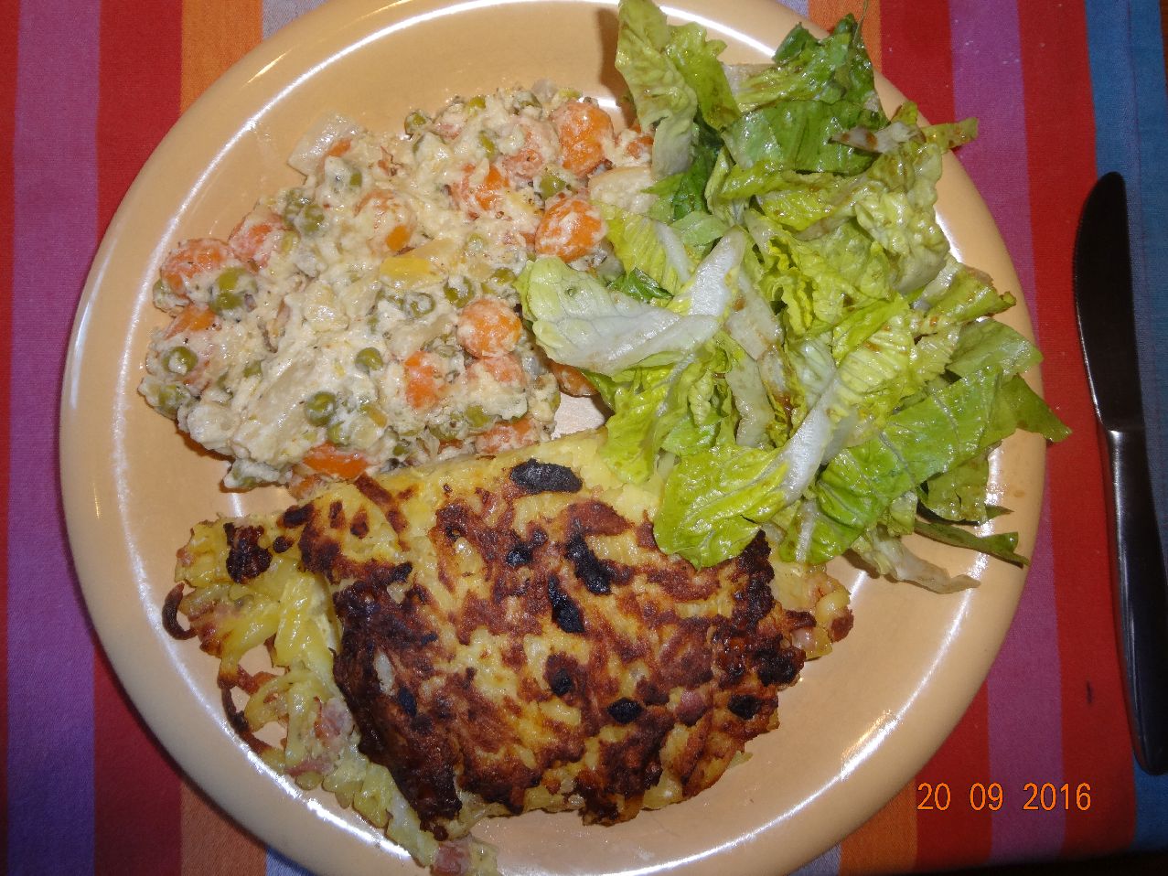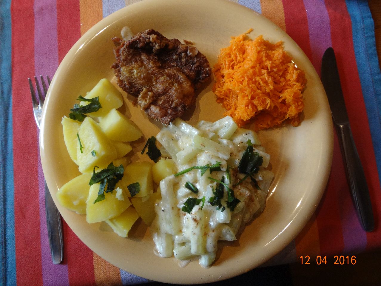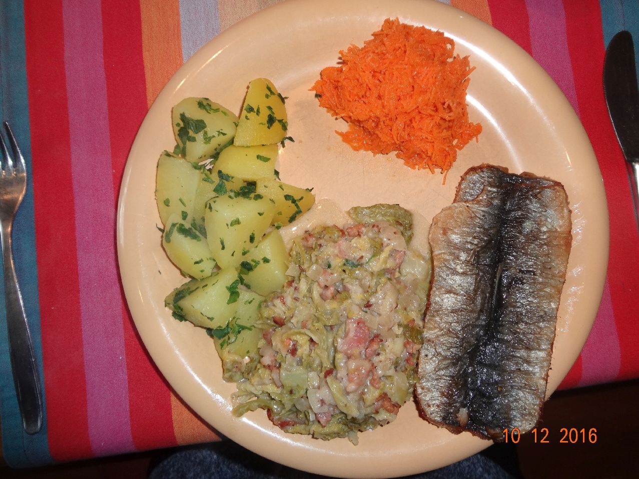 | | Gemüse-Bratkartoffeln, Matjes-Filets in selbstgemachter Mayonnaise, Möhrensalat |