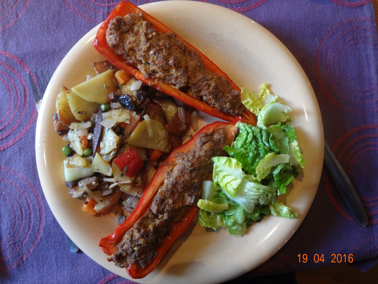 | | Mit Lamm-Hack gefüllte Paprika, Bratkartoffeln mit Asia-Gemüse, Salatherzen |